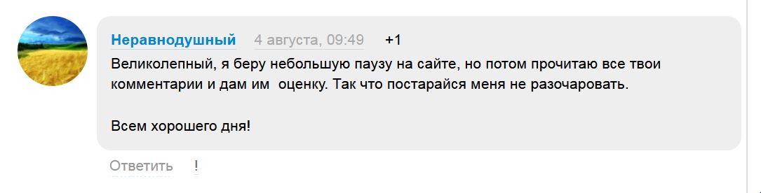 Неравнодушный Неравнодушный 4 авг, 09:49 +1 Великолепный, я беру небольшую паузу на сайте, но потом прочитаю все твои комментарии и дам им оценку. Так что постарайся меня не разочаровать.