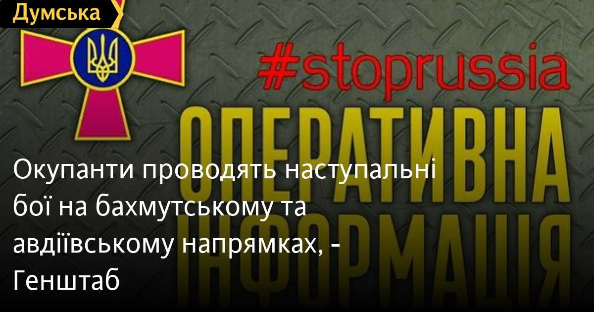 Ворог проводить наступальні бої на бахмутському та авдіївському напрямках, намагається артилерійським вогнем витіснити наші підрозділи із зайнятих рубежів, йдеться в ранковому зведенні Генштабу Збройних сил України.