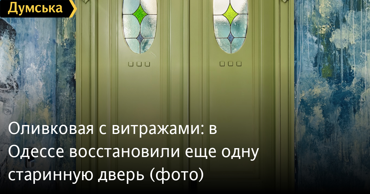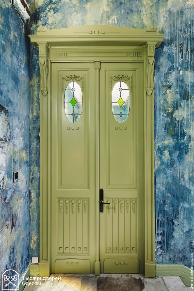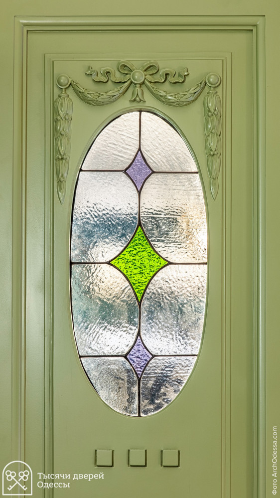 По словам основателя проекта Константина Емельянова, дверь решили сделать оливковой — в цвет первого слоя краски. Кроме того, реставраторы украсили дверь лаконичными витражами.