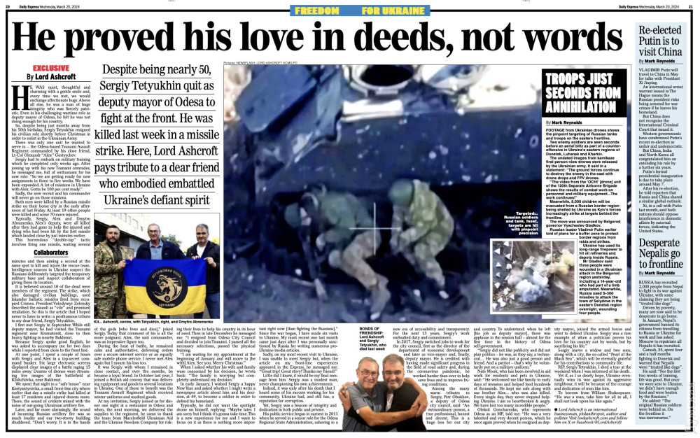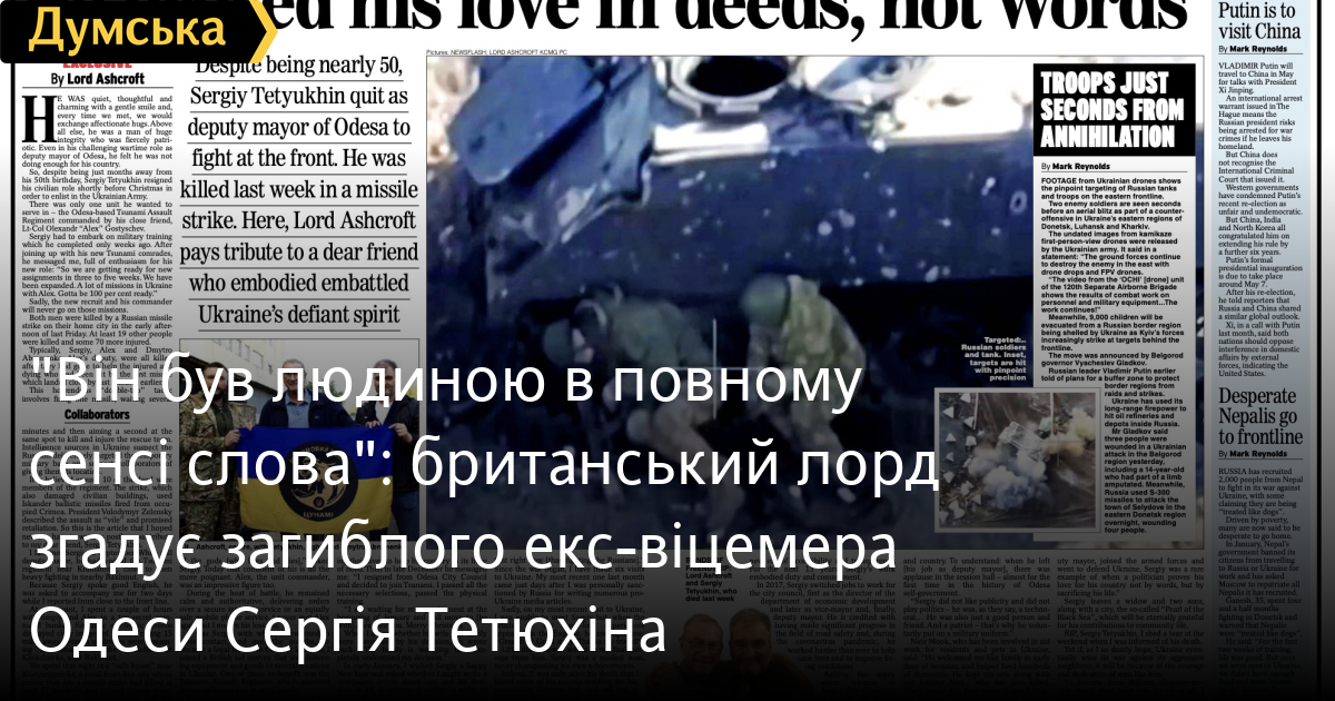 Відомий британський бізнесмен і політик, колишній голова Консервативної партії лорд Майкл Ентоні Ешкрофт написав великий некролог у пам'ять про колишнього заступника одеського міського голови Сергія Тетюхіна, який восени 2023 року добровольцем пішов у військо й загинув унаслідок ворожого ракетного обстрілу 15 березня. Майкл Ешкрофт в останні два роки безліч разів був в Україні, в Одесі та інших тилових містах, а також безпосередньо на лінії фронту, куди відвозив волонтерську допомогу нашим військовослужбовцям. Під час цих поїздок він кілька разів зустрівся з Сергієм Тетюхіним — вони стали близькими друзями. Також лорд знав загиблих разом із Тетюхіним командира штурмового полку «Цунамі» Олександра Гостищева і заступника начальника Нацполіції в Одеській області Дмитра Абраменка, яких також згадує в некролозі.