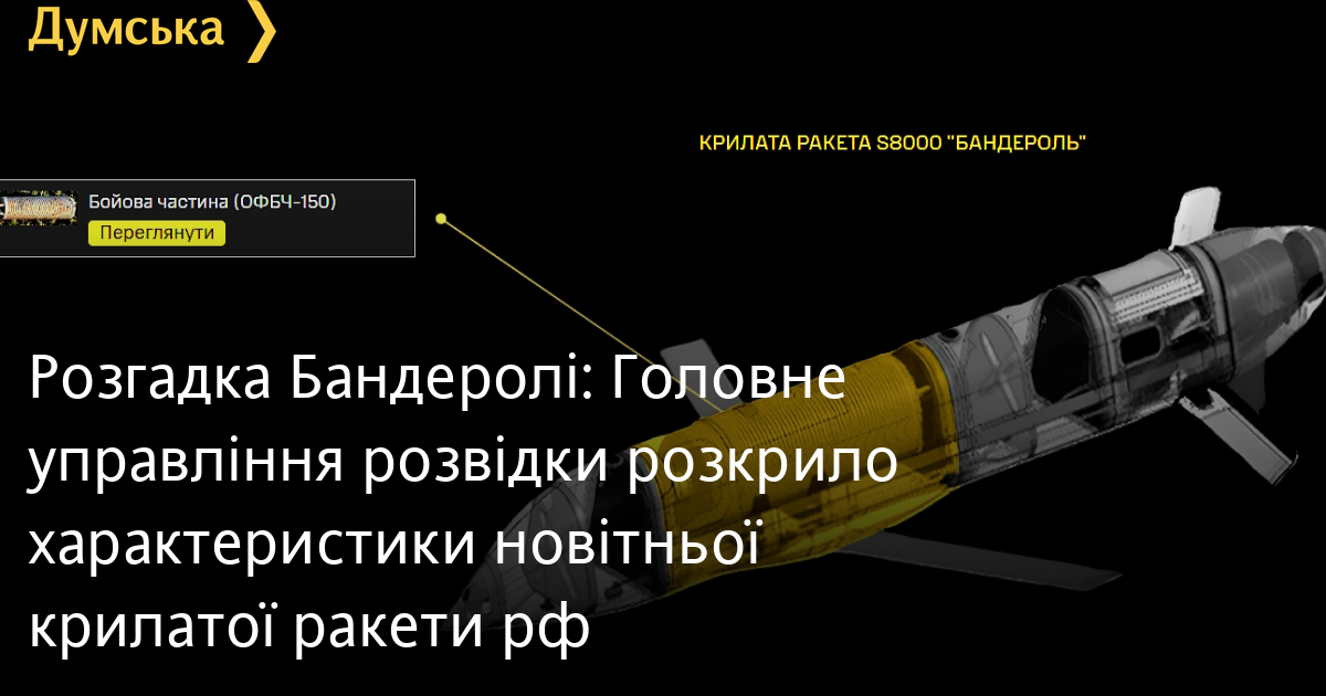 Розгадка «Бандеролі»: Головне управління розвідки розкрило характеристики новітньої крилатої ракети рфТактико-технічні характеристики новітньої російської крилатої ракети, яку кілька разів використовували для атаки південних областей України, з'ясували в Головному управлінні розвідки. Йдеться про ракету S8000, що отримала кодову назву «Бандероль». Треба зазначити, що ракета ще проходить випробування — судячи з усього, ворог запускав по південних регіонах дослідні зразки, однак військовим треба знати її характеристики, щоб збивати цю нову зброю. У «Бандеролі» використано кілька іноземних компонентів, здебільшого китайських — реактивний двигун Swiwin SW800 Pro, що вільно продається на AliExpress за ціною 16 тисяч доларів, інерціальна навігаційна система та модуль телеметричної інформації RFD900x австралійського виробництва або його китайська копія. Також використовується японський акумулятор компанії Murata і південнокорейські сервоприводи Dynamixel MX-64AR. Електроніка «бандеролі» складається з двох десятків чипів американських, японських, китайських і південнокорейських виробників. Утім, це не свідчить про співпрацю цих компаній із РФ, просто всі ці компоненти можна вільно купити в інтернеті. Розвідники з'ясували, що дальність становить близько 500 км за швидкості руху ракети 500 км на годину, а бойова частина (ОФБЧ-150) несе 50 кг вибухової речовини. Ракета має довжину корпусу 5 метрів, діаметр 0,3 метра, крило розкладається після старту і має розмах 2,2 метра. Максимальна швидкість 620-650 км на годину, як паливо для двигуна використовується гас. Виробник — АТ «Кронштадт». Цікаво, що стартовим майданчиком для запуску є безпілотник типу «Оріон», який також розроблявся цим конструкторським бюро, у перспективі його спробують пристосувати для запуску з вертольотів Мі-28Н. Оглядач «Думської» Олексій Сухий вважає, що це небезпечна зброя, проти якої нам треба виробити методи протидії. «Нам не можна недооцінювати противника, зараз він випробує новітню крилату ракету, яка стартує з великого безпілотника. «Оріони» вважалися розвідниками, але мабуть ворогу вдалося розширити його призначення. Можливо, пара «Оріонів» працюватиме разом над морем — один за допомогою вбудованої апаратури радіотехнічної розвідки буде шукати ціль, а з другого здійснюватиметься запуск підвішеної на пілонах «бандеролі». Поки що ворог не застосовує ці ракети масово по Одеській області — вони проходять випробування і ще не запущені в серійне виробництво, але нам треба бути готовими до їх застосування», — зазначив оглядач. СМЕРТЬ РОСІЙСЬКИМ ОКУПАНТАМ! Помітили помилку? Виділяйте слова з помилкою та натискайте control-enter |