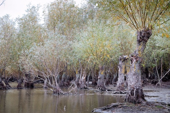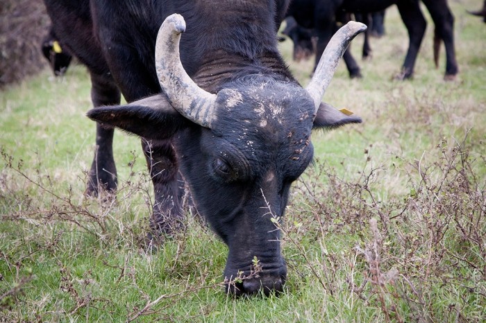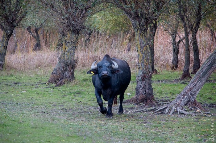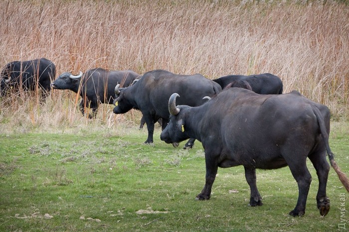 Семь буйволиц, пять быков и три маленьких теленка без труда адаптировались к новому месту и спокойно гуляют между вербами, с интересом рассматривая людей и пробуя на вкус дунайскую осоку и камыш. Невдалеке стоит ошарашенная украинская корова и с удивлением смотрит на «понаехавших».