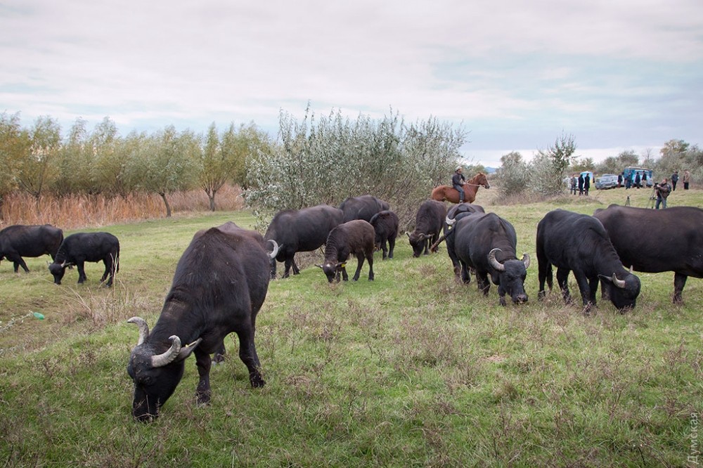 Операция «Буффало»: как в одесское Придунавье карпатско-индийских буйволов выпускалиКорреспондент «Думской» познакомился с экспериментальным стадом азиатских буйволов, которое недавно создали возле села Орловка Ренийского района Одесской области. Животных привезли из Закарпатья, где последние годы воссоздают популяцию этого вида. Слово Александру Гиманову. Огромный черный буйвол, словно сошедший со страниц произведений Редьярда Киплинга, лежа на зеленой траве, подставляет выпуклые бока парню в шляпе. Мишка – двухсоткилограммовый бык, млеет, как большой кот, когда ему чешут шерстку, и с удовольствием позирует перед камерами трех десятков журналистов, окруживших диковинного для наших краев зверя. Человек в шляпе — тезка быка. Мишель Якоби, молодой немец с тонкими чертами лица и повадками ковбоя, приехавший восемь лет назад в Украину, чтобы разводить карпатских буйволов — самых северных родственников азиатского парнокопытного, воспетого Киплингом в «Книге джунглей». Вчера днем 14 его подопечных первый раз прошлись по пойме реки Картал возле Орловки. Семь буйволиц, пять быков и три маленьких теленка без труда адаптировались к новому месту и спокойно гуляют между вербами, с интересом рассматривая людей и пробуя на вкус дунайскую осоку и камыш. Невдалеке стоит ошарашенная украинская корова и с удивлением смотрит на «понаехавших». Мишель знакомит нас со своими питомцами. У каждого из буйволов есть имя. Вот Кристина – девушка с тяжелой судьбой. Мишель спас ее от ножа, выкупив у предыдущего владельца. Буйволица обожает немца и понимает все его команды с полуслова. А вот к другим людям относится настороженно. Кристина — не самая умная. Настоящий рогатый гений – Рая. По словам Мишеля, к человеку она относится, скорее, снисходительно, «телячьих» нежностей не терпит и с легкостью может сбежать практически из любого загона. С буйволами немец общается жестами: поднимет голову вверх – приветствует, машет в сторону и назад – прогоняет. По словам Мишеля, эти животные по уровню интеллекта приближаются к собакам и выстраивают с каждым человеком персональные взаимоотношения. Они в основном любят ласку (кроме Раи), причем за почесывание сойдет и поездка верхом: человека на своем крупе эти могучие животные, способные тащить груз весом 250 кг и более, как ношу не воспринимают и с удовольствием катают желающих. Буйвол — многофункциональное животное, как и привычный нам домашний бык (корова). Их разводят на мясо и используют в качестве тягловой силы. Но особо ценится буйволиное молоко — из-за повышенного содержания белка и жира. Именно из него делают оригинальную моцареллу. Впрочем, доить буйволиц в разы сложнее, чем обычных коров. «Буйволы понимают, что вы забираете молоко себе, и если вы при них не поделитесь с теленком, больше к себе не подпустят, — рассказывает Мишель. – В Италии им вкалывают окситоцин, чтобы можно было спокойно доить. Из своих буйволиц я спокойно могу доить только трех». Немец старается раздавать животных разнополыми парами, потому как считает неестественным, когда на огромное поголовье коров приходится всего пару самцов. Тем самым он спасает своих подопечных от ножа. С учетом того, что все буйволицы, приехавшие в Орловку, беременны, уже в следующем году стадо буйволов будет насчитывать 22 головы. Как писала «Думская», 
