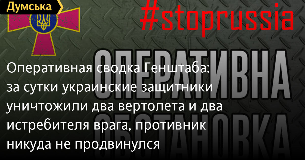 Вооруженные силы Украины во взаимодействии с другими составляющими сил обороны дают достойный отпор войскам противника, в частности, за предыдущие сутки были уничтожены два вертолета, два истребителя (один из которых Су-34) и два БПЛА.