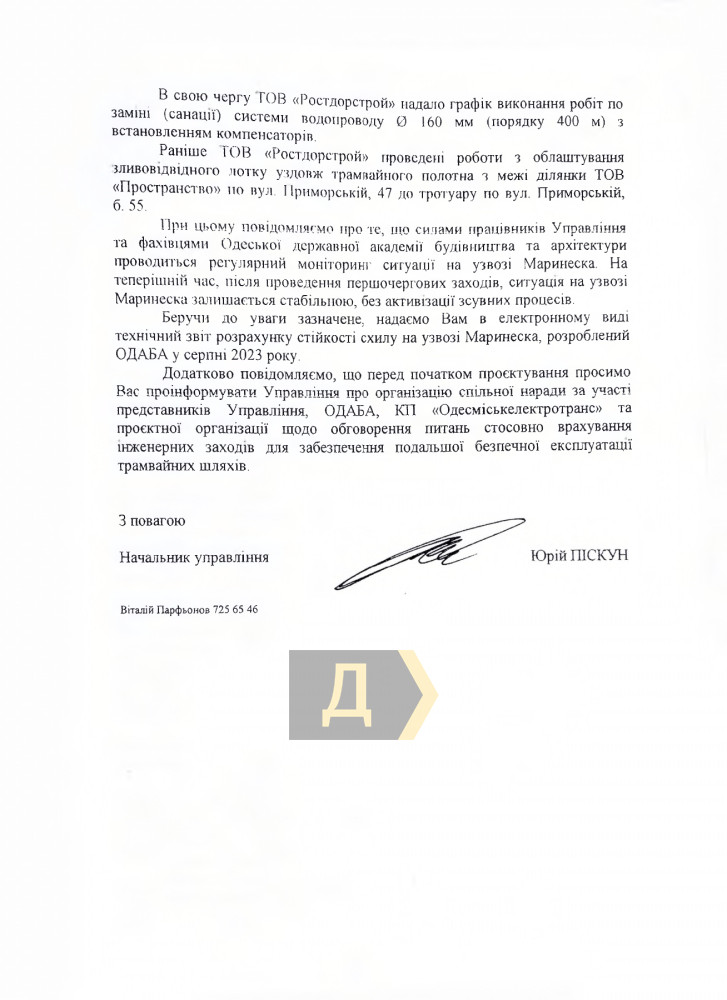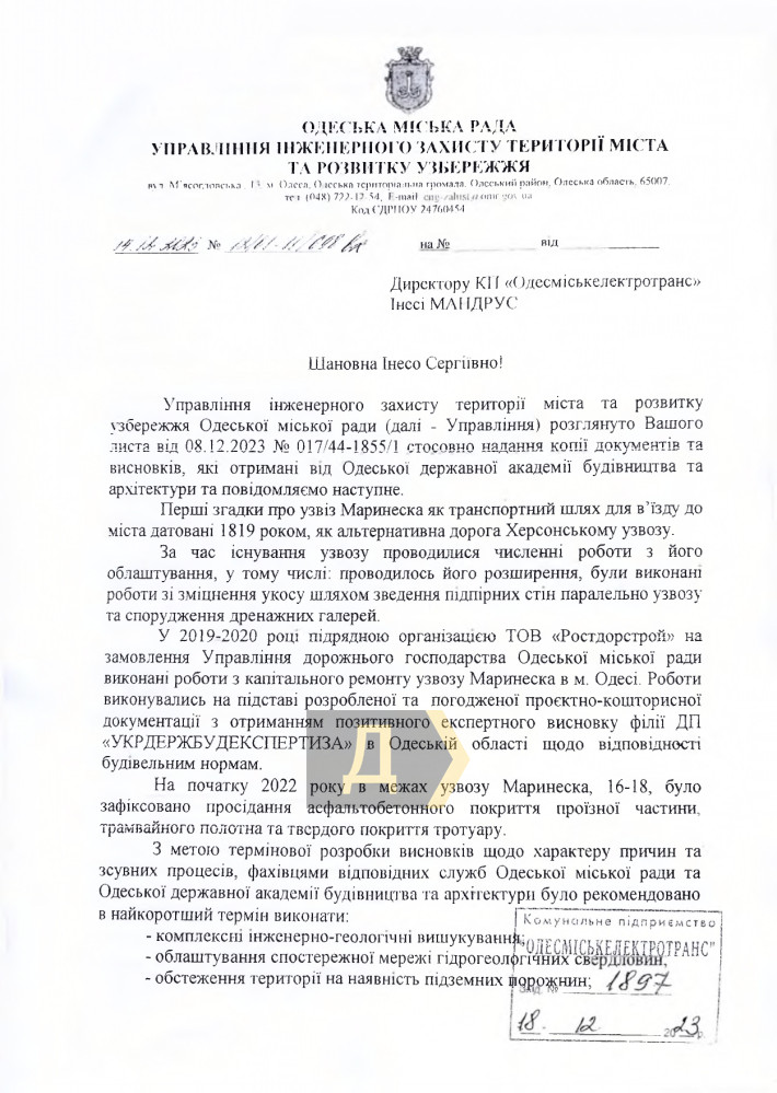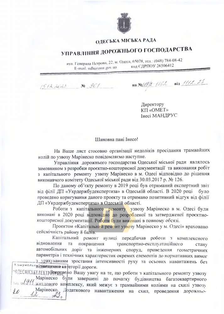 Одновременно «Одесгорэлектротранс» забросал письмами управления дорожного хозяйства и инженерной защиты территории города. Видимо в этой чиновничье-коммунальной среде уже понимали, что крайним сделают подразделение мэрии.