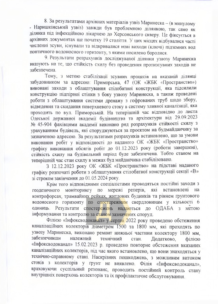 «По результатам архивных материалов спуск Маринеско (в прошлом – Нарышкинский спуск) всегда был проблемным участком, так же как участок под инфекционной больницей в Херсонском сквере (как бы не назвали причиной недавнего обрушения это, а не тот факт, что у власти лет 15 до него не доходили руки, — Ред.). Это фиксируется в архивных документах еще в начале XIX века. В этих местах происходили многочисленные оползни, существовали и открывались новые выходы (ключи) подземных вод понтичного водоносного горизонта, с которыми усиленно сражались», — говорится в ответе на обращение ОГЭТ.