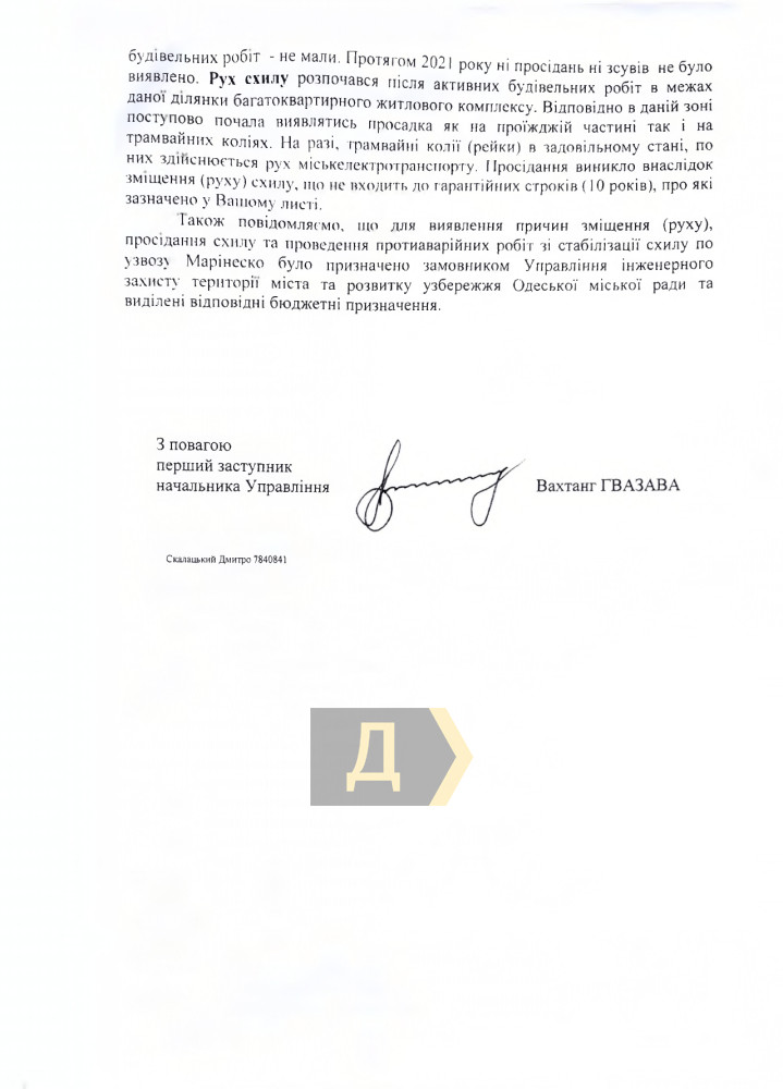 «На данный момент, трамвайные пути (рельсы) в удовлетворительном состоянии, по ним осуществляется движение горэлектротранспорта. Проседание возникло вследствие смещения (движения) склона, что не входит в гарантийные сроки (10 лет), о которых указано в Вашем письме», — говорится в ответном письме управления дорожного хозяйства за подписью первого заместителя Вахтанга Гвазавы.