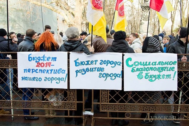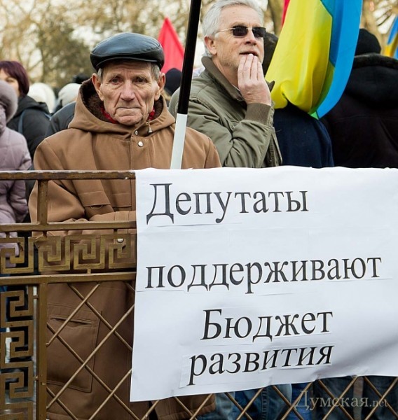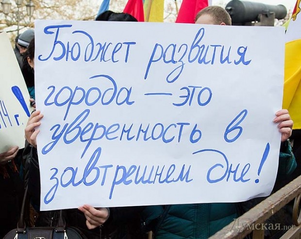 Параллельно на площади проходил немногочисленный митинг в граждан с городской символикой и с флагами Партии Регионов. Они пришли, чтобы поддержать проект решения сессии об использовании бюджета развития. Напомним, на сегодняшней сессии предполагается внести поправки в бюджет города, которыми, в частности, будет ликвидирован «депутатский фонд», средства которого распределяются по заявкам отдельных депутатов. Такое решение предлагается в связи с тем, что некоторые депутаты оказываются неспособными правильно оформить документы, в связи с чем часть денег оказывается неиспользованной и «пропадает». В прошлом году депутатский фонд составлял 12 миллионов гривен, или примерно 0,4% городской казны.
