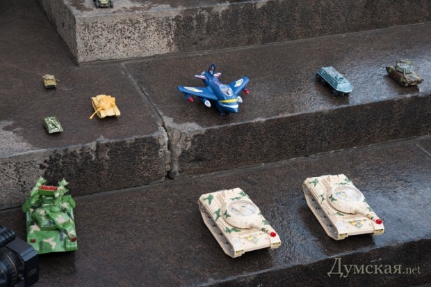 Думу атаковало полтора десятка единиц военной техники — танки, бронетранспортеры и вертолеты. Техника, правда, была не настоящей, а игрушечной — на радиоуправлении.