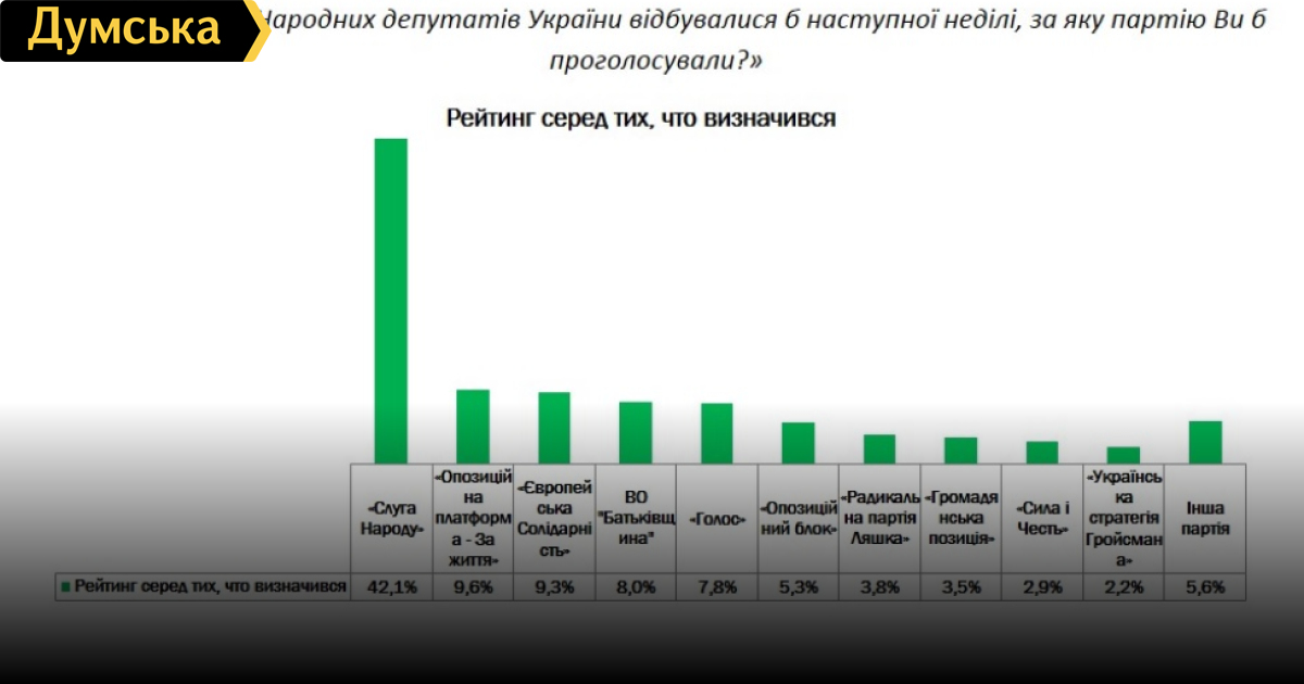 Так, если бы выборы проходили в ближайшее воскресенье, за партию «Слуга народа» проголосовали бы 36,5% опрошенных (42,1% среди тех, кто определился). Второе, третье и четвертое места с разницей в пределах погрешности занимают «Оппозиционная платформа — За жизнь» с результатом 8,3% (9,6% от определившихся), «Европейская Солидарность» — 8,1% (9,3%) и ВО «Батькивщина» 6,9% (8%). Партия «Голос» получила 6,7% голосов (7,8%). «Оппозиционный блок» готовы поддержать 4,6% опрошенных, или 5,3% среди тех, кто определился.