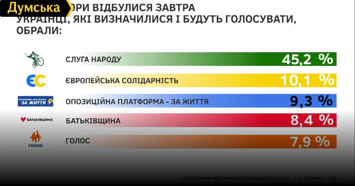 Опрос Info Sapiens: «Европейская солидарность» обходит «Оппозиционную платформу» (политика)По результатам опроса исследовательского агентства Info Sapiens, в Верховную Раду проходят пять партий. Так, за партию «Слуга народа» готовы проголосовать 45,2% от тех, кто определился с выбором. За «Европейскую солидарность» — 10,1%. «Оппозиционная платформа — За жизнь» набирает 9,3%. ВО «Батькивщина» — 8,4%. Партия «Голос» — 7,9%. Остальные партии набирают менее 5% голосов. Исследование проводилось в период с 27 июня по 7 июля 2019 года методом личного интервью на дому у респондента. Выборка составляет 880 человек в возрасте от 18 лет. Последнее время многие социологические службы констатируют прирост рейтинга партии Петра Порошенко «Европейская солидарность». СМЕРТЬ РОСІЙСЬКИМ ОКУПАНТАМ! Помітили помилку? Виділяйте слова з помилкою та натискайте control-enter