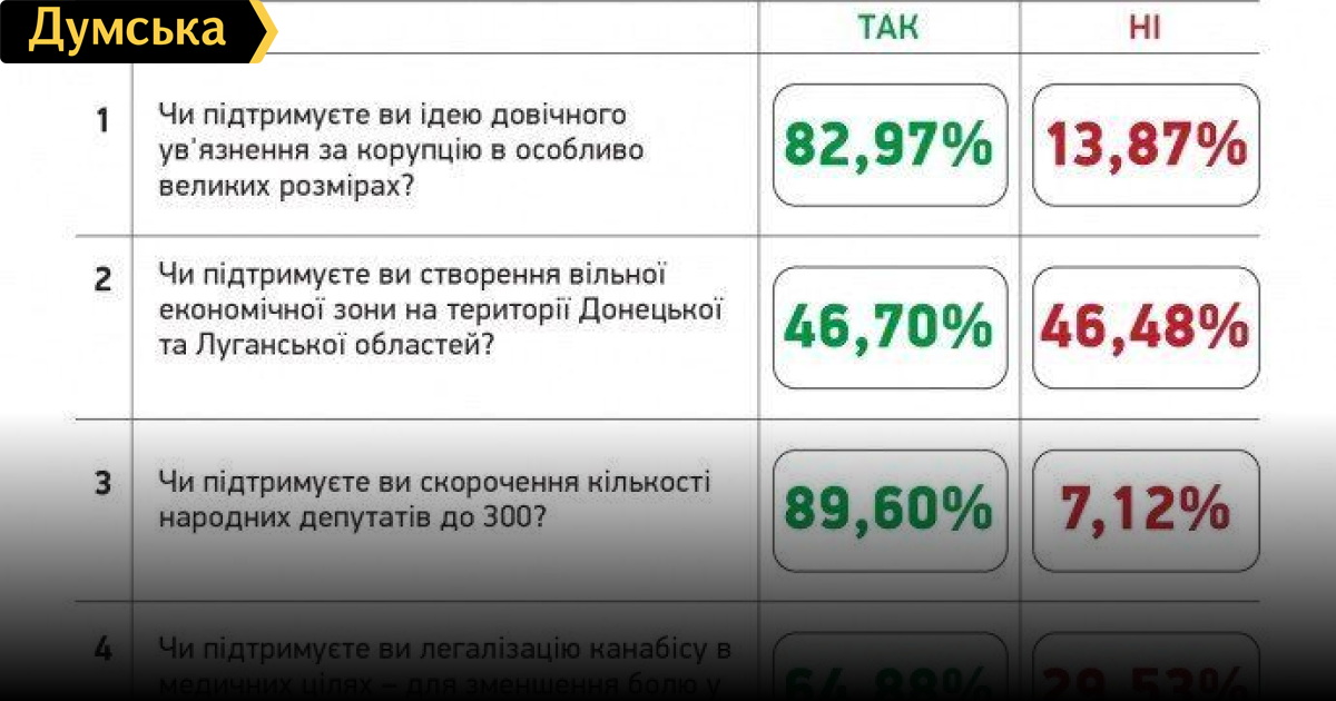 Партія «Слуга народу» проводила рекламну кампанію, піарячись на «референдумі», принаймні на радіо таких роликів було предостатньо. Тобто це опитування — все одно, що поставити перед дільницею в день голосування рекламний білборд однієї з партій.