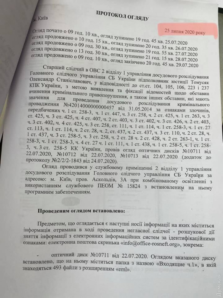 В «папке Арьева» есть также протокол осмотра носителей информации от 25 июля 2020 г., осуществленного в рамках этого уголовного производства. Документ подписан следователем СБУ, содержит фамилии «вагнеровцев», чьи личные данные и разговоры с которыми были на этих носителях информации.