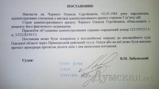 Судья Приморского районного суда Одессы Владимир Лабунский постановил арестовать на пять суток соорганизатора одесского «Евромайдана» Алексея Черного.