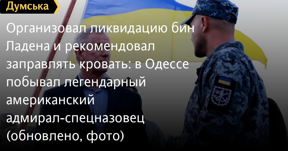 Організував ліквідацію бін Ладена і рекомендував заправляти ліжко: в Одесі побував легендарний американський адмірал-спецпризначенецьКолишній командувач сил спеціальних операцій США адмірал Вільям Макрейвен побував в Одесі. Як повідомляє кореспондент «Думської», воєначальник зустрівся з командуванням українських Військово-морських сил, а також виступив перед курсантами та викладачами Військової академії та інституту ВМС. «Іноземна делегація взяла участь у брифінгу щодо безпекової ситуації, — зазначається в повідомленні національного флоту. — Також американські гості відвідали навчальні заклади Військово-морських сил. Крім того, учасники зустрічі обговорили потреби українського флоту для підтримки подальшого сталого розвитку та набуття високого рівня спроможностей». Вільям Гаррі Макрейвен народився 1955 року в містечку Пайнхерст штату Північна Кароліна, але провів більшу частину своїх юнацьких років у місті Сан-Антоніо (штат Техас), де він закінчив середню школу ім. Теодора Рузвельта. Навчався в Техаському університеті в Остіні. Випустився 1977 року зі ступенем бакалавра журналістики. На військовій службі — з 1977 року. Почав курсантом школи фахівців підводного мінування на базі ВМС США Коронадо, у Каліфорнії. Надалі пройшов усі щаблі військової кар'єри в силах морських спеціальних операцій. У 2003 році очолив спецпідрозділ «Оперативна група 121», який брав участь у захопленні іракського диктатора Саддама Хусейна. Очолювані ним підрозділи провели сотні спецоперацій, під час яких було затримано або ліквідовано терористів. 6 квітня 2011 року віце-адмірала Макрейвена за особистим клопотанням президента США Барака Обами представили до звання повного адмірала і зробили головним кандидатом на посаду дев'ятого командувача Командування спеціальних операцій США. 30 червня, після слухань у комітеті сенату США зі збройних сил, кандидатуру Макрейвена було схвалено. 8 серпня 2011 року він приступив до виконання обов'язків. У серпні 2014 року вийшов у відставку. Вільям Макрейвен виконував ключову роль у підготовці, організації та виконанні операції «Спис Нептуна», яка увінчалася ліквідацією лідера ісламістської терористичної організації «Аль-Каїда» Усами бін Ладена. Адмірал Макрейвен тижнями працював із ЦРУ над планом удару і надав три варіанти дій: атака на гелікоптері за участю «морських котиків», бомбовий удар бомбардувальниками B-2, що знищив би укриття, або спільний рейд із пакистанськими спецслужбами, яким повідомили б про операцію за кілька годин до її початку». Президент Барак Обама затвердив перший варіант. Операцію провели 2 травня 2011 року. 17 травня 2014 року прочитав натхненну промову перед випускниками Техаського університету, що ввійшла до скарбниці мотивувальних текстів від американських лідерів для наступних поколінь поряд з аналогічними промовами Стіва Джобса, Арнольда Шварценеггера тощо. Починалася вона зі слів: «Хочете змінити світ? Почніть заправляти своє ліжко». Автор книг «Спеціальні операції. Практичні приклади бойового застосування сил спеціальних операцій: теорія і практика», «Морські історії. Моє життя в спеціальних операціях» та «Заправляй ліжко. 10 простих правил, які можуть змінити твоє жття і, можливо, весь світ». ОНОВЛЕНО О 14:48. Адмірал Макрейвен також зустрівся з начальником Головного управління