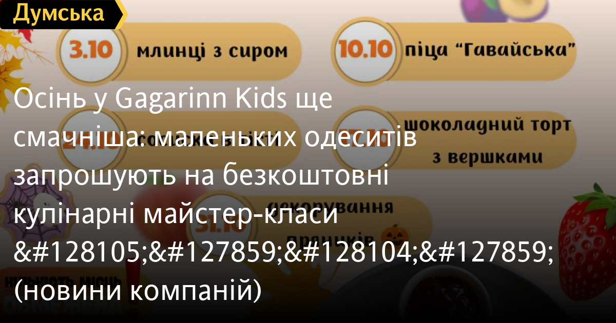 Осінь у Gagarinn Kids ще смачніша: маленьких одеситів запрошують на безкоштовні кулінарні майстер-класи 👩🍳👨🍳 (новини компаній)Gagarinn Kids запрошує ваших діток на безкоштовні кулінарні майстер-класи. 🥞 3 жовтня – Млинці з сиром: готуємо пухкі та смачні млинчики. 🍕 10 жовтня – Піца «Гавайська»: створимо справжню піцу власними руками. 🍰 17 жовтня – Шоколадний торт з вершками: дізнаємось секрет ніжного десерту. 🌭 24 жовтня – Сосиска в тісті: приготуємо хрустку закуску. 🎃 31 жовтня – Декорування пряників: створимо святковий хелловінський настрій. Гаряча лінія: 093 170 70 10 Кількість місць обмежена Адреса: м. Одеса, вул. Аркадійське плато, 5Б ТРК Gagarinn Plaza, 4-й поверх СМЕРТЬ РОСІЙСЬКИМ ОКУПАНТАМ! Помітили помилку? Виділяйте слова з помилкою та натискайте control-enter |