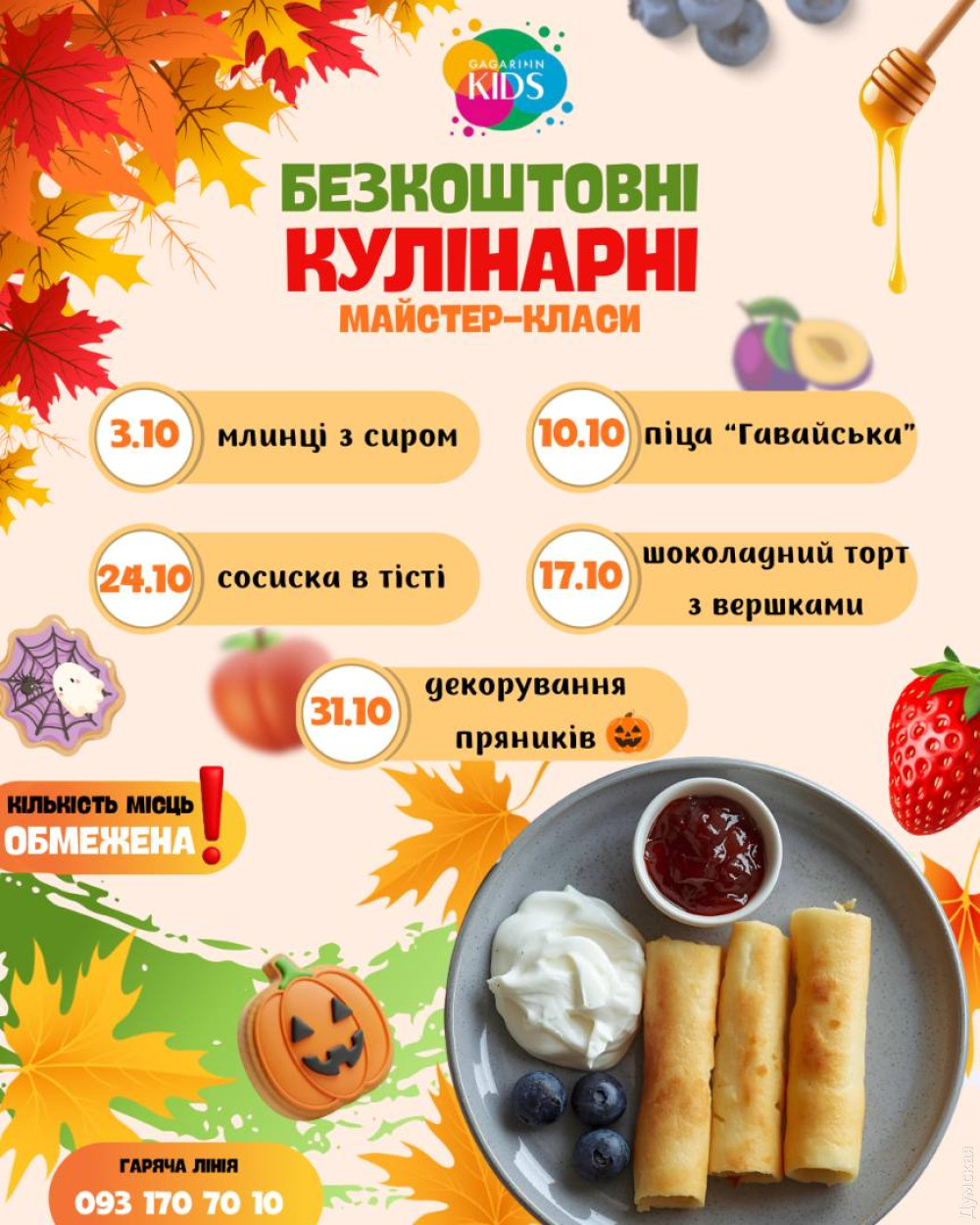 Осінь у Gagarinn Kids ще смачніша: маленьких одеситів запрошують на безкоштовні кулінарні майстер-класи 👩🍳👨🍳 (новини компаній)Gagarinn Kids запрошує ваших діток на безкоштовні кулінарні майстер-класи. 🥞 3 жовтня – Млинці з сиром: готуємо пухкі та смачні млинчики. 🍕 10 жовтня – Піца «Гавайська»: створимо справжню піцу власними руками. 🍰 17 жовтня – Шоколадний торт з вершками: дізнаємось секрет ніжного десерту. 🌭 24 жовтня – Сосиска в тісті: приготуємо хрустку закуску. 🎃 31 жовтня – Декорування пряників: створимо святковий хелловінський настрій. Гаряча лінія: 093 170 70 10 Кількість місць обмежена Адреса: м. Одеса, вул. Аркадійське плато, 5Б ТРК Gagarinn Plaza, 4-й поверх СМЕРТЬ РОСІЙСЬКИМ ОКУПАНТАМ! Помітили помилку? Виділяйте слова з помилкою та натискайте control-enter |