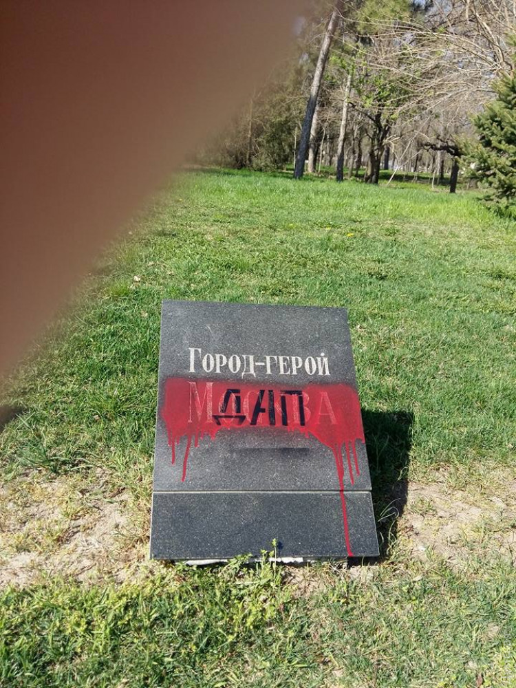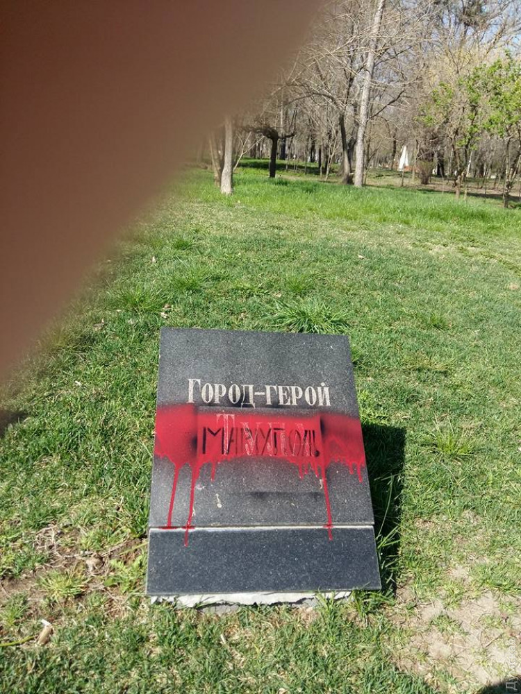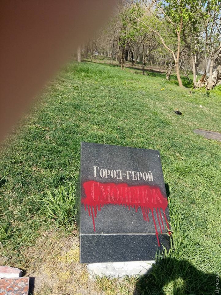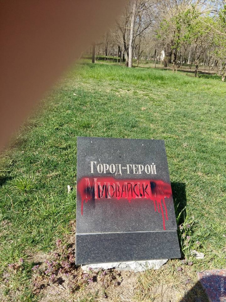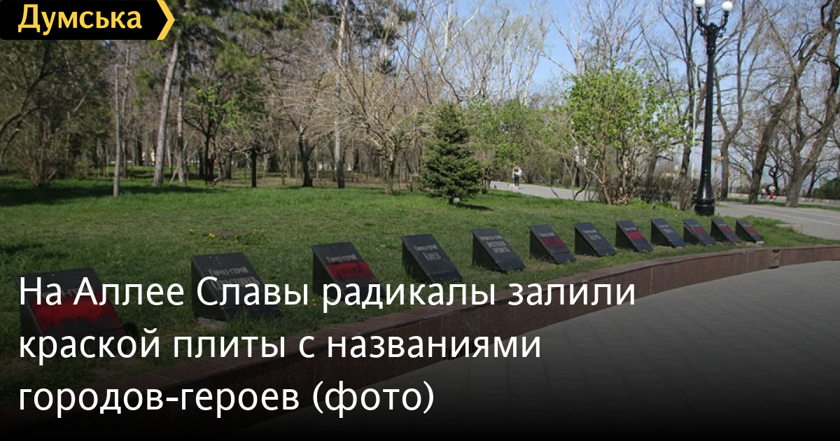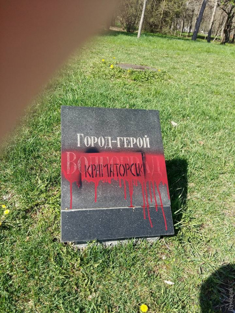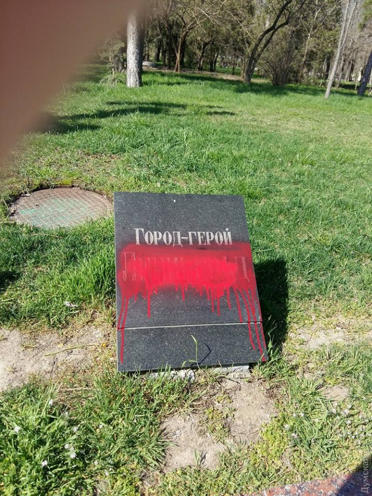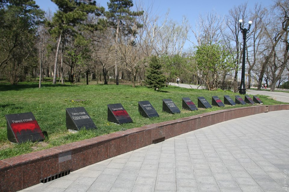 Вандалы (провокаторы?) залили красной краской плиты с названиями городов-героев на Аллее Славы в одесском парке Шевченко.