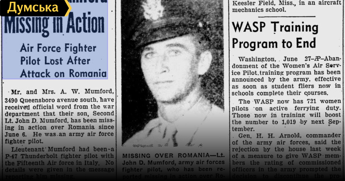 Сегодня в киевском парке Вечной славы прошла церемония чествования американского летчика-истребителя, который был сбит 6 июня 1944 года над территорией нынешнего Болградского района Одесской области. Останки пилота переданы представителям посольства Соединенных Штатов. Поисковые работы на территории Одесской области координировали офицеры отдела военно-гражданского сотрудничества оперативного командования «Південь» Владислав Назаров и Александр Громаков. Они организовали совместные действия военнослужащих ВСУ, районных и местных властей, представителей Агентства по поиску пленных и пропавших без вести Минобороны США, ученых Национального военно-исторического музея Украины и владельцев поля, на котором находился сбитый самолет. ![]() Сообщение об исчезновении американского летчика Джона Мамфорда в американской газете, июнь 1944 года Поисковым работам предшествовала тщательная подготовка: была сделана геодезическая съемка и установлены точные координаты места падения, сотрудники военно-исторического музея и украинские офицеры прошли специальный курс по поиску и эксгумации тел погибших на базе ВМС США. После завершения работ поле было рекультивировано, а его владельцам компенсированы все неудобства. Даже сейчас, спустя 70 лет после окончания той войны, американцы очень серьезно относятся к поиску своих пропавших военных. Этим занимаются и волонтеры, и правительственные агентства. Достаточно сказать, что на поиски летчика в Болградский район прибыли четыре официальных представителя США. Как рассказал корреспонденту «Думской» Владислав Назаров, жители области с пониманием отнеслись к миссии и оказали поисковикам всяческое содействие. В результате поисковых работ на глубине 3-3,5 метра были обнаружены фрагменты истребителя «Мустанг» и части тела летчика. К сожалению, именной жетон пилота найти не удалось, но уже сегодня можно с уверенностью говорить о том, что в кабине «Мустанга» находился 23-летний младший лейтенант Джон Мамфорд. Истребитель Мамфорда был сбит 6 июня 1944 года, когда он сопровождал группу американских бомбардировщиков, вылетевших с аэродрома Пирятин (Полтавская область) на бомбардировку румынского порта и аэродрома Галац. Истребители выполнили свою задачу — все «летающие крепости» вернулись без потерь. Прикрытию повезло меньше: его атаковали румынские самолеты. В завязавшейся «собачьей свалке» американцы сбили шесть королевских машин и потеряли два «Мустанга». До недавнего времени считалось, что Мамфорда сбили над Черным морем, однако пожилые жители Новых Троян утверждают, что видели этот воздушный бой своими глазами. Отметим, что село находится на прямой линии от Галаца к Полтаве и в 70 километрах от морского побережья. Последний этап поиска — экспертиза, которая должна окончательно установить личность погибшего. Ее проведут в США, после чего тело пилота будет предано земле (скорее всего, на Арлингтонском национальном кладбище). «Мустанг» Р-51 Мамфорда стал первым американским истребителем этого типа, который сбили румынские летчики. Победу записал на свой счет лучший ас королевства Константин Кантакузино, который пилотировал «Мессершмит» Bf-109G. Всего за время Второй мировой капитан Кантакузино совершил 608 боевых вылетов, сбил 45 советских, американских и немецких самолетов. Еще 11 воздушны