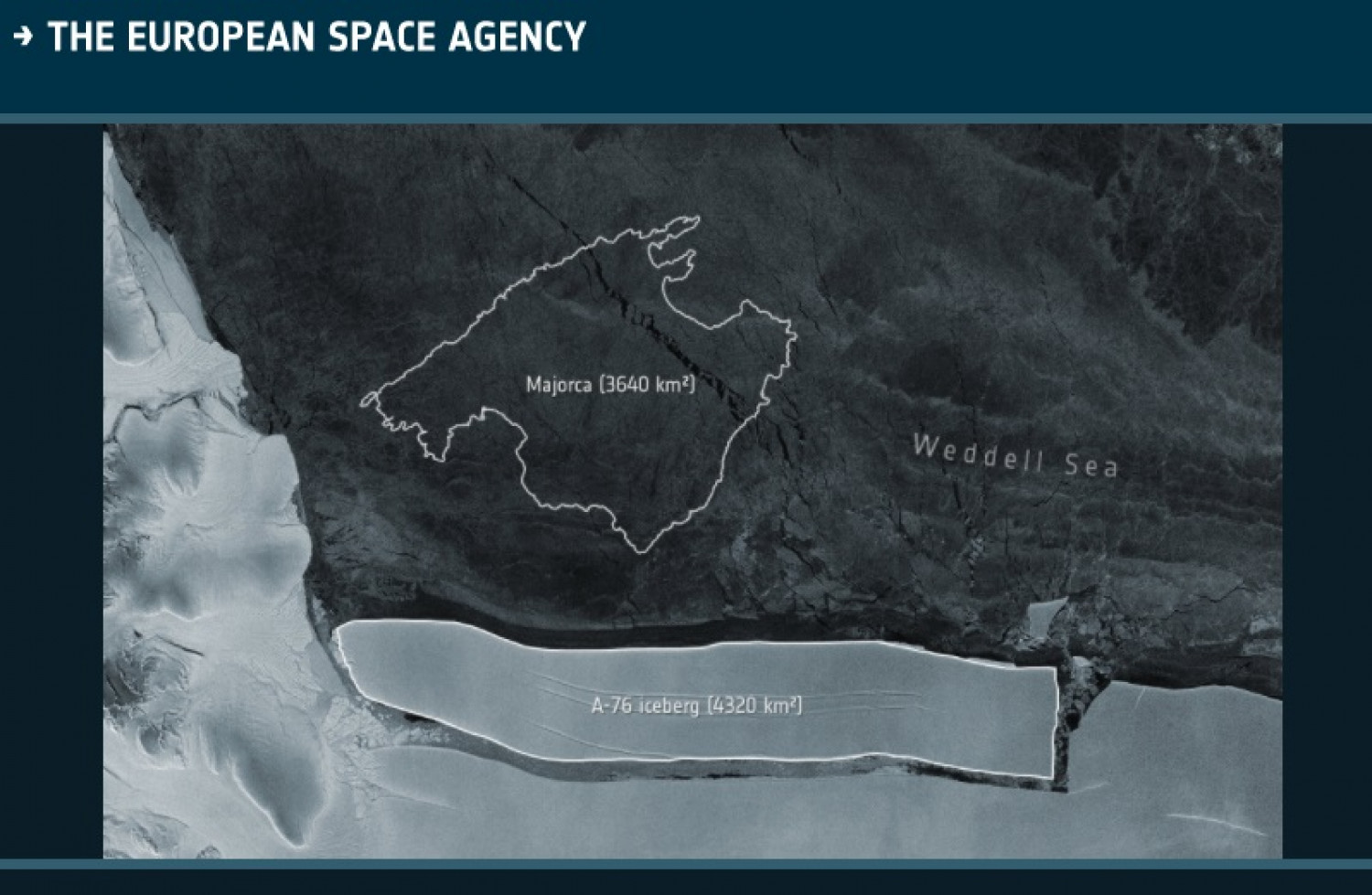 От Антарктиды откололся огромный айсберг площадью больше испанского острова МайоркаВ западной части шельфового ледника Ронне в Антарктиде откололся гигантский айсберг общей площадью примерно 4320 квадратных километров. Об этом сообщает сайт Европейского космического агентства (ESA). Айсберг получил название «А-76». Его длина 170 километров, ширина — 25 километров. На снимке ESA приводит в сравнение размер айсберга с испанским островом Мальорка, у которого площадь 3640 квадратных километров. На данный момент А-76 находится в море Уэдделла. В море также находится айсберг А-32А, площадь которого в момент откалывания от Антарктиды составила 3880 квадратных километров. СМЕРТЬ РОССИЙСКИМ ОККУПАНТАМ! Заметили ошибку? Выделяйте слова с ошибкой и нажимайте control-enter |