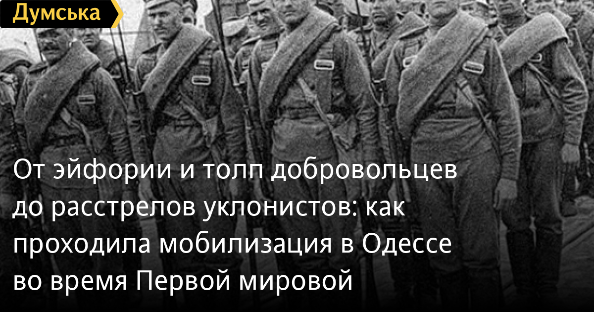 Від ейфорії та натовпів добровольців до розстрілів ухилянтів: як проходила мобілізація в Одесі під час Першої світовоїПитання загальної мобілізації, методів, якими вона проводиться, справедливості призову до армії, строків служби та ухилення від неї зовсім не нове. Україна в цьому плані нічим не виділяється серед країн, яким у різні часи доводилося йти на подібні суворі заходи. Списи через мобілізаційні процеси ламали з самого моменту появи масових регулярних армій, що поповнювалися за таким принципом. «Думська» вирішила згадати колишні мобілізаційні кампанії, що проводилися в Одесі та її околицях. І почнемо ми з Першої світової війни. Українці тоді, нагадаємо, воювали по обидва боки фронту. Наше місто було у складі Російської імперії. БЕЗСТРОКОВА МОБІЛІЗАЦІЯ «ДО КІНЦЯ ВІЙНИ» І ВОЛОГІ МРІЇ ПРО ПРОТОКИ І «ЦАРГРАД» До армії та військово-морського флоту імперії Романових призивали всіх здорових чоловіків старше 21 року. До початку світової війни термін служби в сухопутних військах становив 3-4 роки, на флоті – 4 роки, ті, хто відслужив, зараховувалися до запасу на 15 років. Перебування в запасі означало, що під час мобілізації чоловік береться до зброї, причому безстроково – до указу імператора. Після закінчення терміну «запасу» ті, хто відслужив як у флоті, так і в армії до 43 років, значилися воїнами ополчення. Це означало, що, якщо трапиться війна, людина буде служити на нестройовій посаді. Малюнок з газети «Одеські новини», серпень 1914 року Під час першої хвилі загальної мобілізації в імперії були призвані всі запасні нижні чини та офіцери, а також частина воїнів державного ополчення першого та другого розрядів. Розряди воїнів на сучасну мову можна перекласти приблизно як «обмежено придатний до стройової служби» і «придатний виключно до нестройової, допоміжної служби». Втім, протягом Першої світової війни воїни ополчення всіх двох розрядів майже поголовно були мобілізовані та, попри придатність до стройової служби, були направлені в чинні війська. Також в процесі війни призовний вік був знижений з 21 до 20 років. Конкретних термінів мобілізації ніхто і ніколи, ні на початку війни, ні в кінці, офіційно не оголошував. За замовчуванням вважалося, що мобілізовані зобов'язані воювати до перемоги, хоча умов перемоги в Першій світовій тодішні володарі імперії, по суті, не знали. Одні генерали та політики мріяли про повну поразку «германця» — Тройственного, а потім Четвертного союзу в особі Німеччини, Австро-Угорщини, Османської імперії та Болгарії й країн, що приєдналися. Інші вельможі вважали головною метою війни завоювання турецьких проток — Босфору і Дарданелл, а також «Царгорода» — Стамбула. Треті мріяли про «визволення дружніх» народів на Балканах, нові території – захід України – і мільйонні репарації. Втім, вже в 1917 році «германець» переможно входив в Україну і Білорусь, а фантазії тодішніх імперців про нові території, протоки та «Царгороді», так і залишилися мріями. Як і в Україні зразка 2022 року, перші місяці мобілізації супроводжувалися ейфорією і чергами охочих приєднатися до армії біля призовних пунктів. Масовий характер набувають втечі з дому малолітніх одеситів з метою потрапити на фронт. Ось кілька газетних заміток того часу. Липень-серпень 1914 року: «Вчора на збірний пункт військового начальника з'явилася велика гр