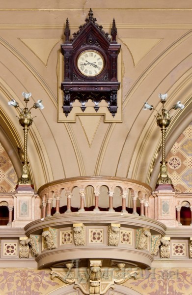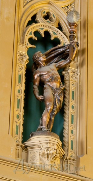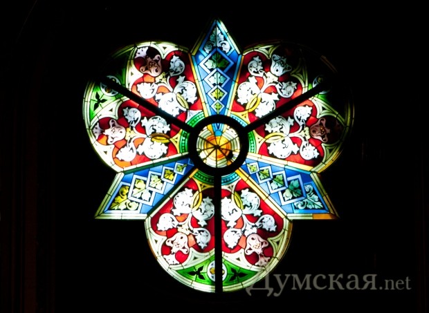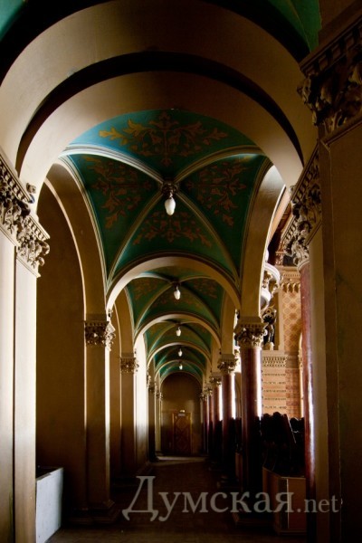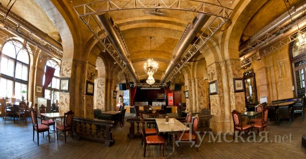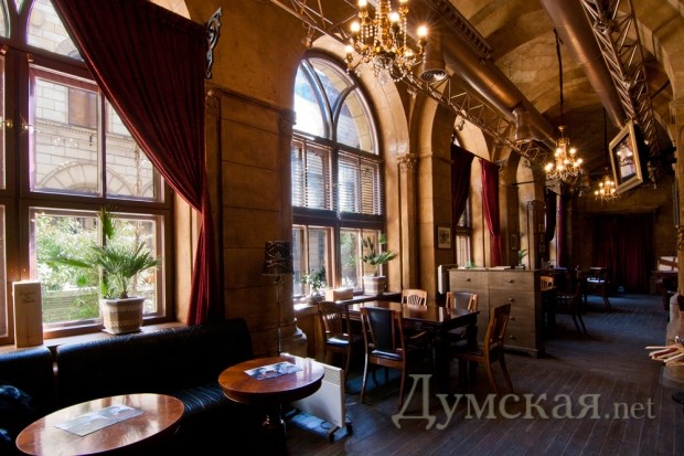 Боковой вход на ул. Пушкинской вёл в ресторан и на хоры главного зала. На хорах могло поместится 200 человек. Сам главный зал огромен по площади — 910 кв. м. В окнах – двойные рамы: металлические и деревянные, наружные стёкла бельгийские, внутренние кафедральные. Окна изготовлены в Карлсруэ. Для вечернего освещения использовалось 119 калийных ламп и 23 изящных бра. В нишах на пилястрах – 8 бронзовых фигур, держащих факела с электрическими лампочками. Автором скульптур был известнейший скульптор Одессы Б. Эдуардс.