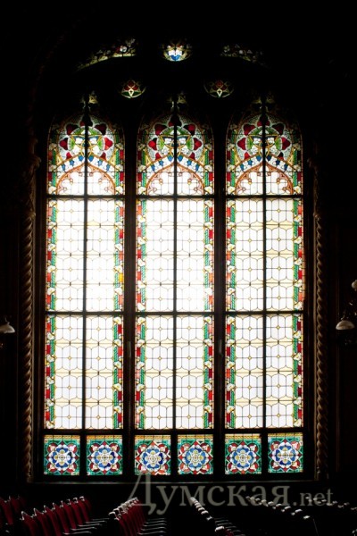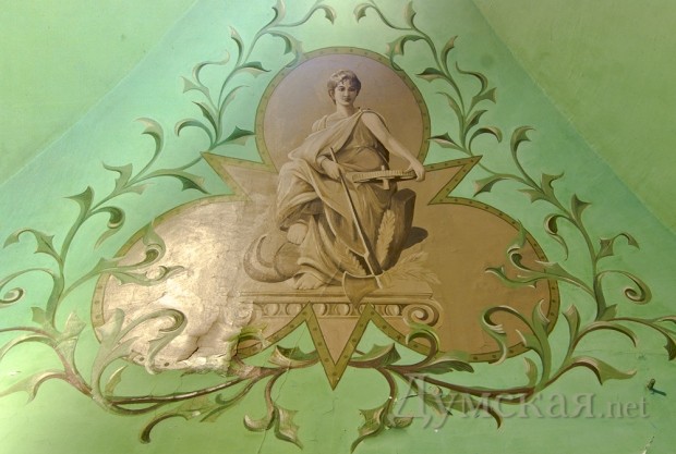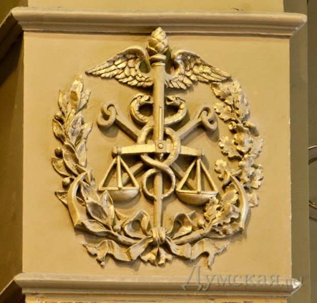 «В эти помещения вела мраморная лестница из передней. На стене украшенной живописью надпись «In labore robur est» (В труде сила), а над входными дверями зала собрания купечества «Mercatus toetore nectit» (Торг силён договором). В зале выборных собраний купеческих сословий на потолке четыре женских фигуры, символизирующих Европу, Азию, Африку и Америку. В стене против главного входа в зал – панно с портретом государя Императора в полный рост. Над портретом государя – корона, скипетр и держава, по бокам герб Императора и герб государства, ниже гербы Одессы и Херсонской губернии. Там же подпись из золота (12 августа 1898 года) – дата занимательной ноты императора».