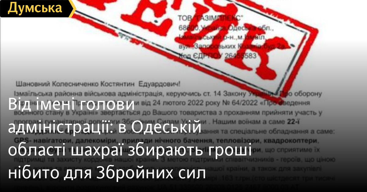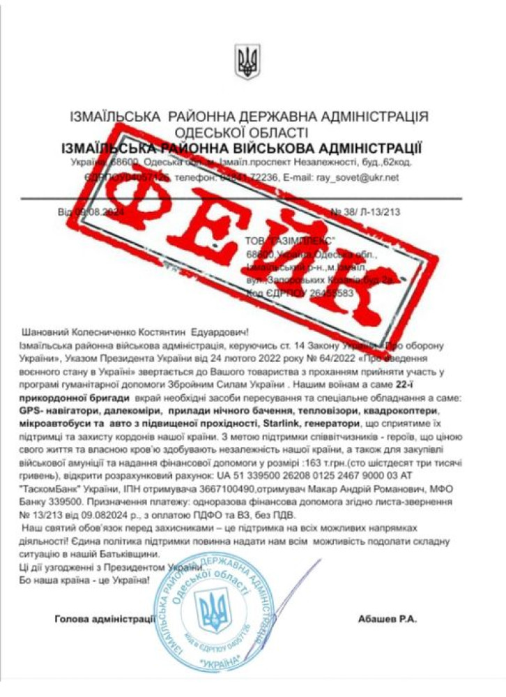 Підроблені листи від імені голови Ізмаїльської військової районної адміністрації Одеської області поширюють шахраї по регіону.