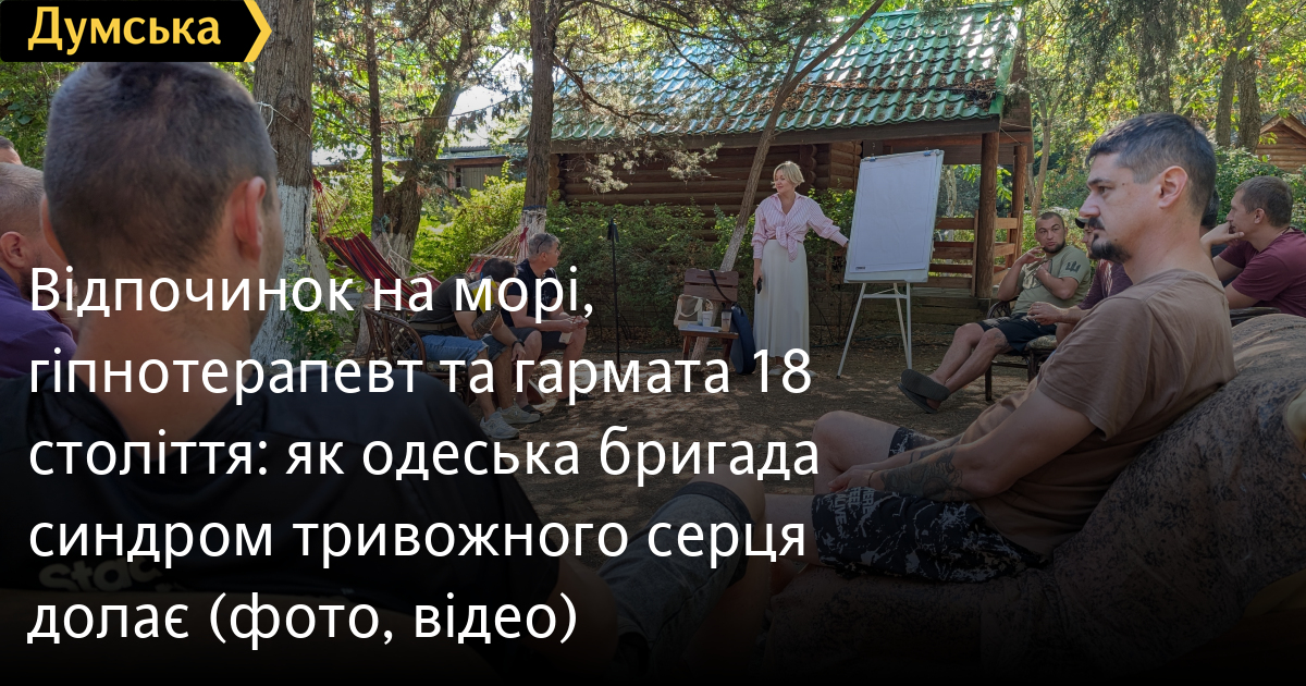 Відпочинок на морі, гіпнотерапевт та гармата 18 століття: як одеська бригада синдром «тривожного серця» долає (фото, відео)Вранці йога після сніданку групова терапія з психологом, вдень відпочинок на морі. А ще верхова їзда, аромо- та звукотерапія. В унікальному таборі для військових створили всі умови, щоб наші захисники могли не лише відпочити, а й повністю перезавантажитися, і повернутися до строю з новими силами Кореспондент «Думської» побувала у Navycamp, Центрі реабілітації одеської 39-ї окремої бригади берегової оборони, де ветеранів буквально витягують із прірви того, що психологи минулого називали синдромом «тривожного серця», а зараз ми знаємо як посттравматичний стресовий розлад. Для Ворона, Ігоря Воронецького, війна почалася ще з 2014 року. Тоді він спочатку волонтерив, потім був добробат. 24 лютого 2022 року з ще кількома побратимами з Майдану прийшов у військкомат, всі вони потрапили до 122-ї одеської бригади тероборони. Ігор став командиром контрдеіверсійної роти. Потім десь рік працював інструктором з цього ж профілю. Потім ще два роки у розвідці був командиром відділення, дронщиком, командиром взводу. Тоді Ігор і перейшов до 126-ї бригади, яка стала сьогодні 39-ю бригадою берегової оборони. Сьогодні він командир роти. Сюди він потрапив разом із кількома побратимами. За день до прибуття їхню позицію розбили. Остання ротація була на покровському напрямку, на стику Запорізької, Дніпропетровської та Донецької областей. Зараз ця ділянка вже вибита, зайнята ворогом. Ігор Воронецький «Коли ти там, на передку, найважче — це розлука. По пів року не бачити сім'ю, дружину, дітей, матір, у кожного свої близькі, це дуже виснажує, це дуже пригнічує. Іноді навіть зателефонувати не виходить. Постійний тиск бойових дій і самої служби, структури, бюрократії, все швидко, то, що то в армії. виснажує, і людина стає просто роботом, який навіть не хоче жити», – розповідає Ігор. Ще п'ять годин тому вони були на передку. Біль, кров, невідомість. А зараз дивляться на море та зірки. Або валяються у гамаку. Але тут не лише відпочивають. Групова терапія із психологом проходить щодня. Анастасія Курінна «Ми нарешті дійшли того, що психолога вже не сприймають як щось небезпечне, з ким краще не спілкуватися. Військові психологи 30-го корпусу морської піхоти працюють з різними категоріями: чинними військовими, тими, які повернулися з полону. Звичайно, не можна сказати, що абсолютно всі відкриті для роботи, але взаємодія є. За ці п'ять днів у Navycamp бійці змінюють умови перебування, як то кажуть змінюють картинку, і це працює», — розповідає офіцер 30-го корпусу морської піхоти Анастасія Курінна. Наразі тут проходять реабілітацію військові з 39-ї бригади берегової оборони та морпіхи 36-ї миколаївської бригади. Серед невеличкої галявини стоять стільці та дивани, ротангові крісла. По одному сюди приходять учасники програми. Чоловіки різного віку, статури, балакучі иа мовчазні. У центрі – психолог та гіпнотерапевт з Одеси Ольга Макар. Вона роздає блокноти та ручки. Ось-ось підтягнуться ті, хто запізнився, і сеанс почнеться. «На фронті ці чоловіки живуть лише «нулем», вони втрачають контакт із собою. Моє завдання – повернути їм відчуття тіла, навчити наново чути себе, – каже Ольга Макар. — Є велика частина тих, хто хоче жити. І я завжди говорю: є люди, які бажають жити. І коли вони тут