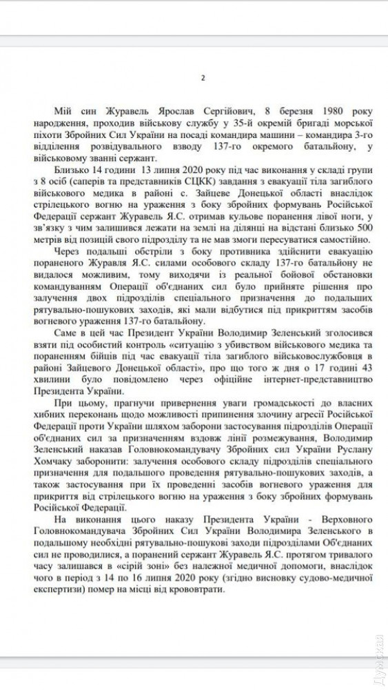Отец разведчика обвиняет Зеленского в том, что он «запретил привлечение подразделений специального назначения для проведения спасательно-поисковых мероприятий» возле Зайцевого. По словам отца, это привело к тому, что раненый Ярослав Журавель погиб от кровопотери в «серой зоне».