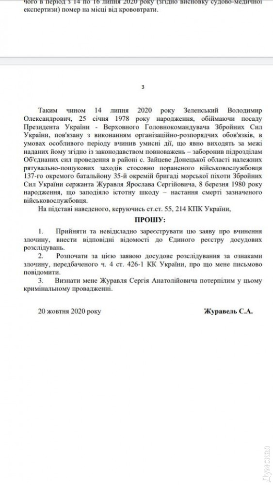 Сергей Журавель требует начать досудебное расследование по ч.4 ст. 426 (бездействие военной власти) Уголовного кодекса Украины. Санкция статьи предусматривает лишение свободы на срок от семи до десяти лет.
