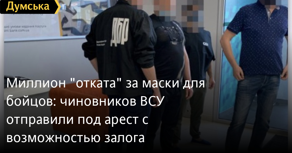 Печерский районный суд Киева отправил под стражу с возможностью внесения залога троих подозреваемых в вымогательстве денег у предпринимателя за поставку медицинских масок для бойцов Вооруженных сил Украины.