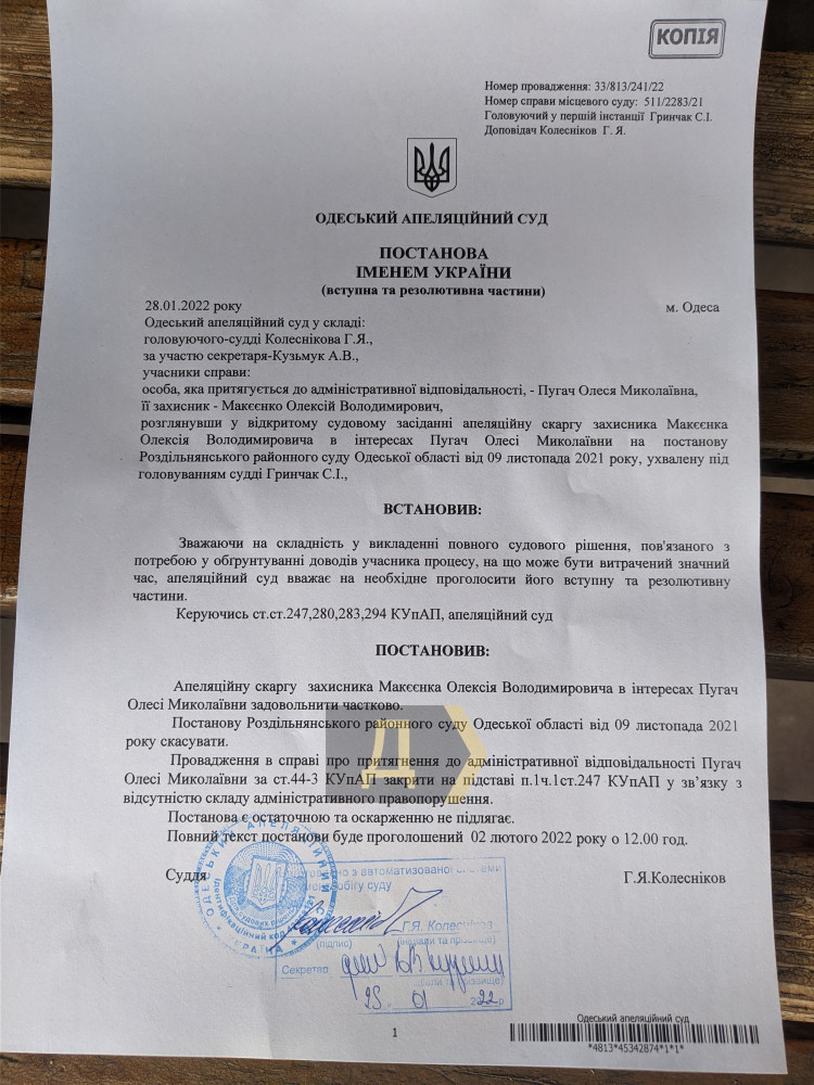 Справедливость восторжествовала! Одесский апелляционный суд отменил абсурдный «ковидный» штрафРешение Раздельнянского районного суда Одесской области о наложении штрафа в размере 17 тысяч гривен на предпринимательницу Олесю Пугач отменил сегодня апелляционный суд. Судья Григорий Колесников закрыл производство об админправонарушении в связи с отсутствием такового. Штраф в 17 тысяч гривен наложила на владелицу магазина в селе Щербанка судья райсуда Светлана Гринчак. Согласно протоколу, составленному полицейскими, предпринимательница торговала в своем магазине без маски, но оштрафовали ее за нахождение на улице без паспорта. По действующему законодательству, штраф за такое нарушение — в сто раз выше. О ситуации Олеся Пугач узнала из публикации на «Думской», когда срок обжалования уже подходил к концу. На просьбу о помощи оперативно откликнулись юристы из компании «Адвокат народа», которые, среди прочего, оказывают правовую помощь в подобных знаковых ситуациях. Благодаря их своевременному вмешательству, штраф удалось обжаловать, и вот сегодня суд принял окончательное решение. Интересы Олеси Пугач в суде представлял адвокат Алексей Макеенко. В своей апелляционной жалобе и в ходе заседания он обоснованно отстаивал точку зрения, что на основании переданных в суд документов привлекать предпринимательницу к ответственности нельзя. Внимательно изучив материалы дела и заслушав позицию адвоката, судья Колесников удовлетворил его жалобу и отменил ошибочное постановление. Полный текст решения будет подготовлен в ближайшие дни. СМЕРТЬ РОСІЙСЬКИМ ОКУПАНТАМ! Помітили помилку? Виділяйте слова з помилкою та натискайте control-enter Новини по цій темі: 4 березня 2023: "Вакцини-довгожителі", або Як щеплення проти COVID-19 перетворилися в Україні на небезпечний ритуал 27 січня 2023: МОЗ зобов`язали опублікувати договори на закупівлю вакцин проти COVID-19: апеляційний суд задовольнив позов журналіста "Думської" 11 січня 2023: За тиждень в Одесі зафіксовано 159 випадків ковіду 4 січня 2023: За тиждень в Одесі зареєстровано 113 випадків ковіду |
