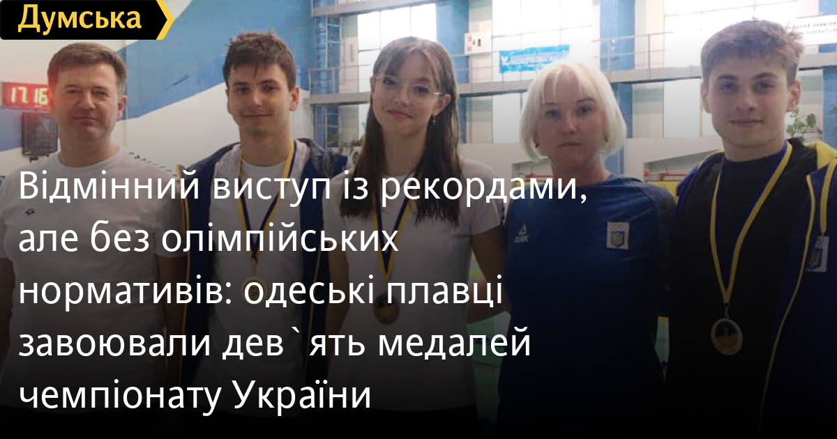 Відмінний виступ із рекордами, але без олімпійських нормативів: одеські плавці завоювали дев`ять медалей чемпіонату УкраїниДев'ять медалей чемпіонату України з плавання завоювали спортсмени Одеської області. Першість проходила в Броварах, повідомили в регіональному відділенні Національного олімпійського комітету. У скарбничці збірної — чотири золоті, три срібні та дві бронзові медалі. Три з них (два золота й срібло) здобув провідний плавець регіону Вадим Науменко. Він переміг на своїй коронній дистанції 200 м комплексом, встановивши при цьому рекорд України (2.00,42), проте олімпійський норматив (1.57,84) йому не підкорився. Також Вадим став чемпіоном на дистанції 100 на спині (56,17), встановивши особистий рекорд, і завоював срібло на 200-метрівці вільним стилем (1.50,83). У 17-річного Олексія Грабарова — чотири медалі (дві золоті, дві срібні). Він став чемпіоном на дистанціях 200 м на спині та 400 м комплексом, а також посів друге місце на 200-метрівці комплексом і 400-метрівці кролем. 15-річна Надія Біловенко виборола бронзу на дистанції 100 м на спині, третьою фінішувала на п'ятдесятиметрівці на спині 16-річна Катерина Караниколова. Тренерка збірної України та СДЮШОР «Динамо» Олександра Курбанова оцінила виступ своїх підопічних як «відмінний». СМЕРТЬ РОСІЙСЬКИМ ОКУПАНТАМ! Помітили помилку? Виділяйте слова з помилкою та натискайте control-enter |