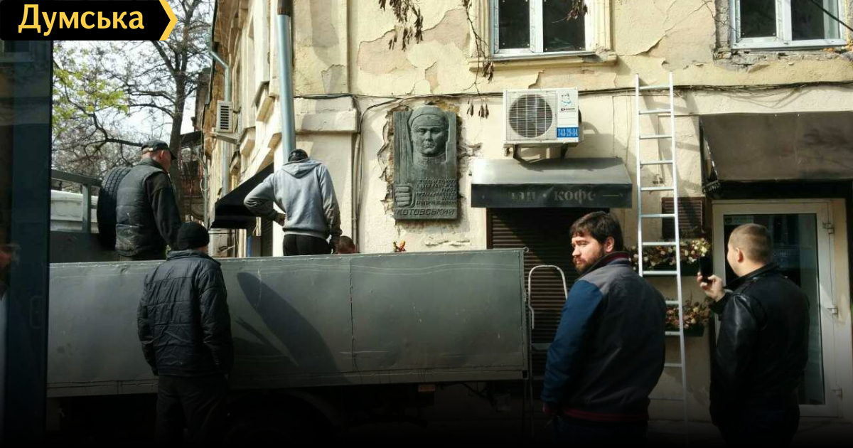 Отодранный от стены барельеф Котовского передадут в музей, а поврежденный фасад отремонтируютМемориальную доску большевистскому командиру Григорию Котовскому, которую сегодня утром коммунальщики таки отодрали от стены дома №14 на Соборной площади, передадут в музей. Об этом «Думской» сообщили в мэрии. Какое именно учреждение будет осчастливлено новым экспонатом, пока неизвестно. Скорее всего, историко-краеведческий. В пресс-службе муниципалитета подчеркнули, что демонтаж мемориальной доски был произведен в соответствии с законом «Об осуждении коммунистического и национал-социалистического тоталитарных режимов». Поврежденную декоммунизацией стену дома отремонтируют. СМЕРТЬ РОСІЙСЬКИМ ОКУПАНТАМ! Помітили помилку? Виділяйте слова з помилкою та натискайте control-enter Новини по цій темі: 24 вересня 2025: Така різна декомунізація: в Одесі перейменували парк, дві вулиці та розбили погруддя Посмітного 19 травня 2025: Розбита дошка Маринеско і погрози «головному» Пушкіну: деколонізатори не відступають попри побої |