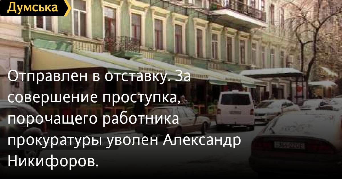 Отправлен в отставку. За совершение проступка, порочащего работника прокуратуры уволен Александр Никифоров.Такое сообщение появилось на официальном сайте областной прокуратуры. Напомним, третьего апреля в ресторане Гранат возник конфликт между двумя посетителями. Одним из них оказался заместитель прокурора области Александр Никифоров. Уже бывший представитель ведомства угрожал охранникам оружием. СМЕРТЬ РОССИЙСКИМ ОККУПАНТАМ! Заметили ошибку? Выделяйте слова с ошибкой и нажимайте control-enter Думская ТВ. Сюжеты: