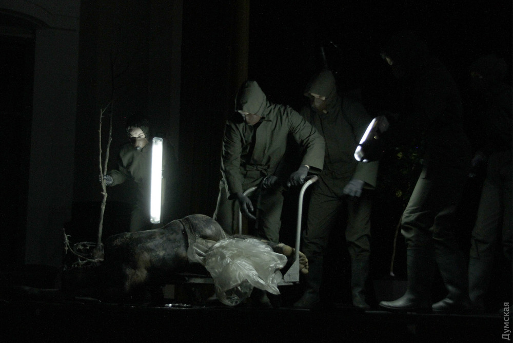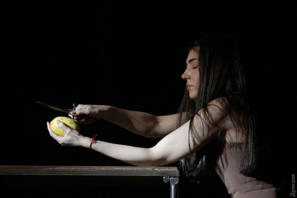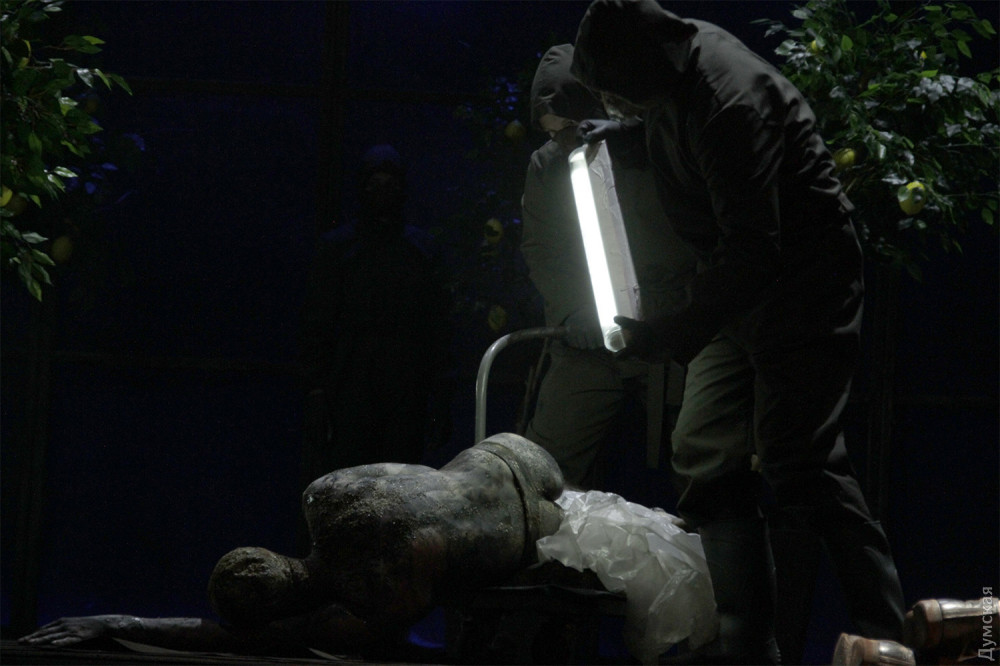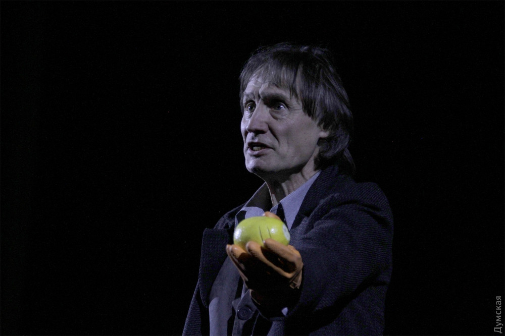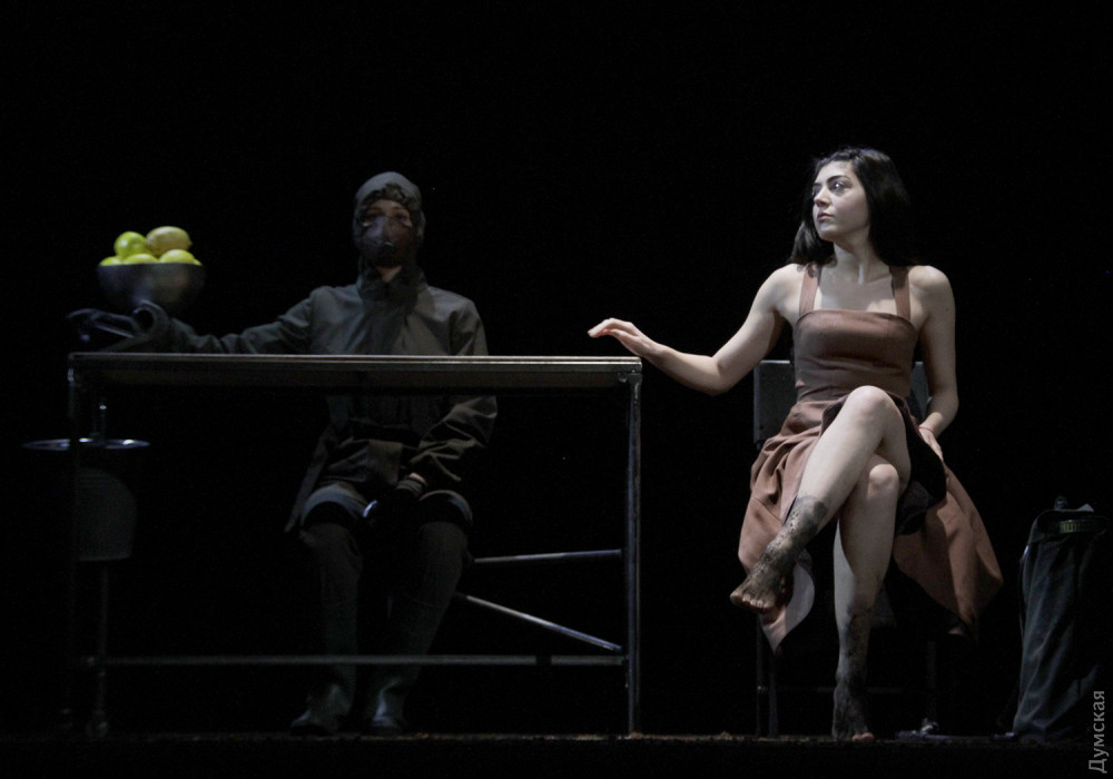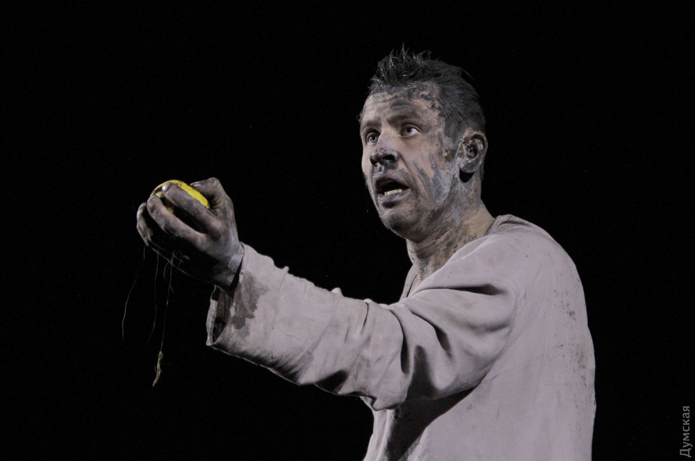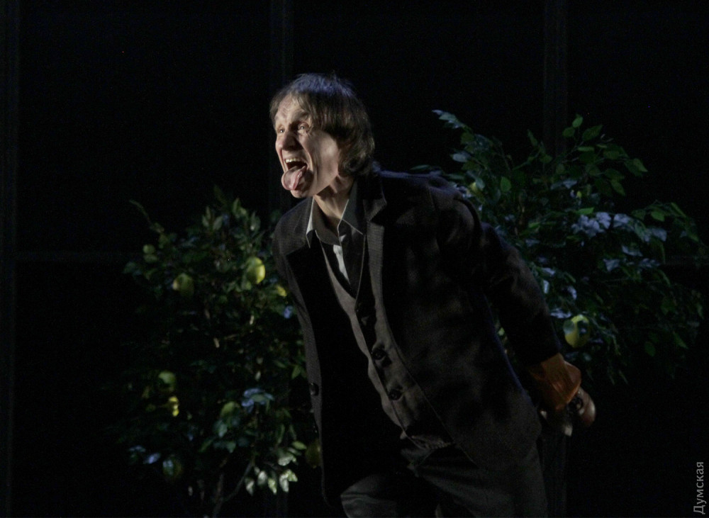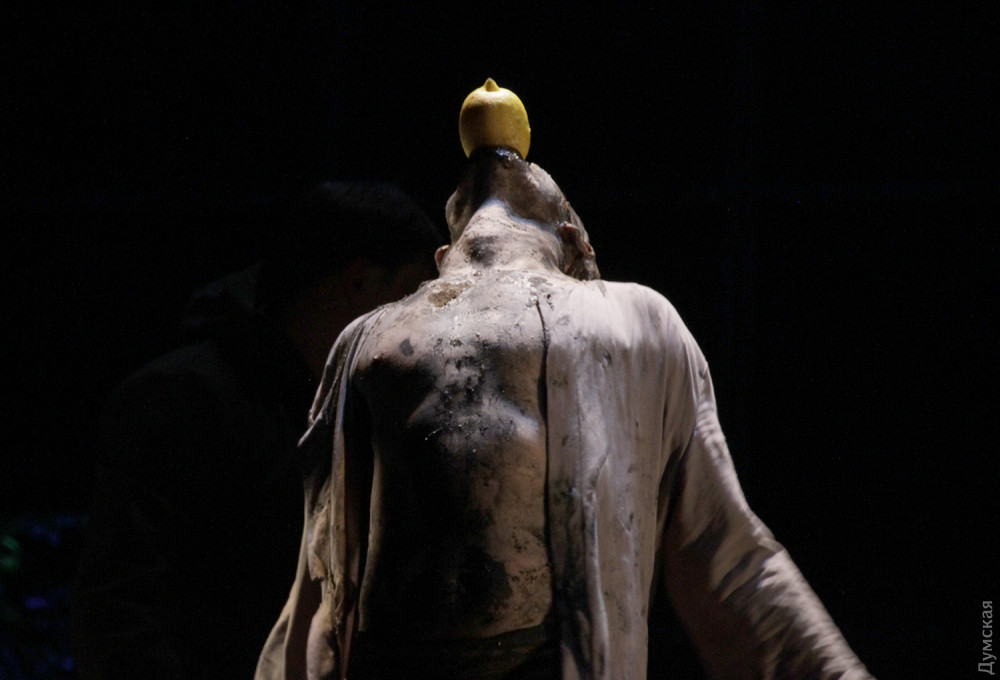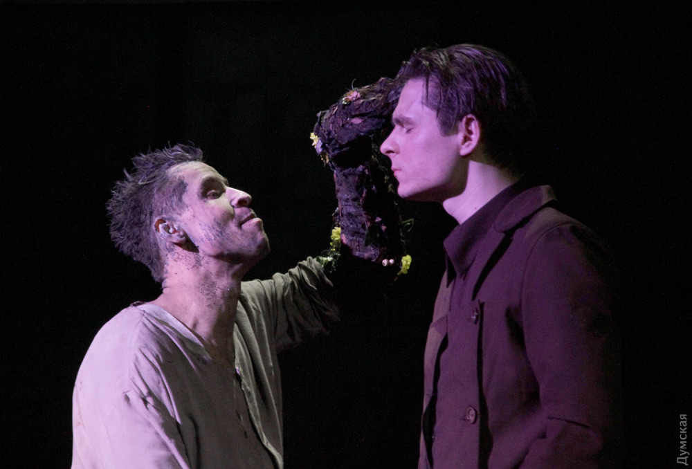 Однако чудовище в этой адской оранжерее не она, шикарная и страстная женщина, а секретарь президента Вурм (Владимир Романко), он появляется весь в земле, словно червь (так переводится его фамилия с немецкого), и точно так же гибок и пластичен. Для тех, кто впервые пришел в театр, впечатление ошеломляющее. Зритель со стажем легко отметит, что манипуляции с лимончиками сродни жонглированию яблочками в предыдущем спектакле Урывского, «Прекрасном рогоносце», столы с соковыжималками напоминают столы со швейными машинками в «Счастье рядом» Дмитрия Богомазова (полиэтиленовые полотнища используются также в богомазовском шедевре), гибкий, раскрашенный с головы до пят Вурм – словно брат родной тени отца Гамлета (опять шедевр Дмитрия Богомазова), а тему проклятой, отравленной и вообще негодной земли Иван поднимал в «Тенях забытых предков»…