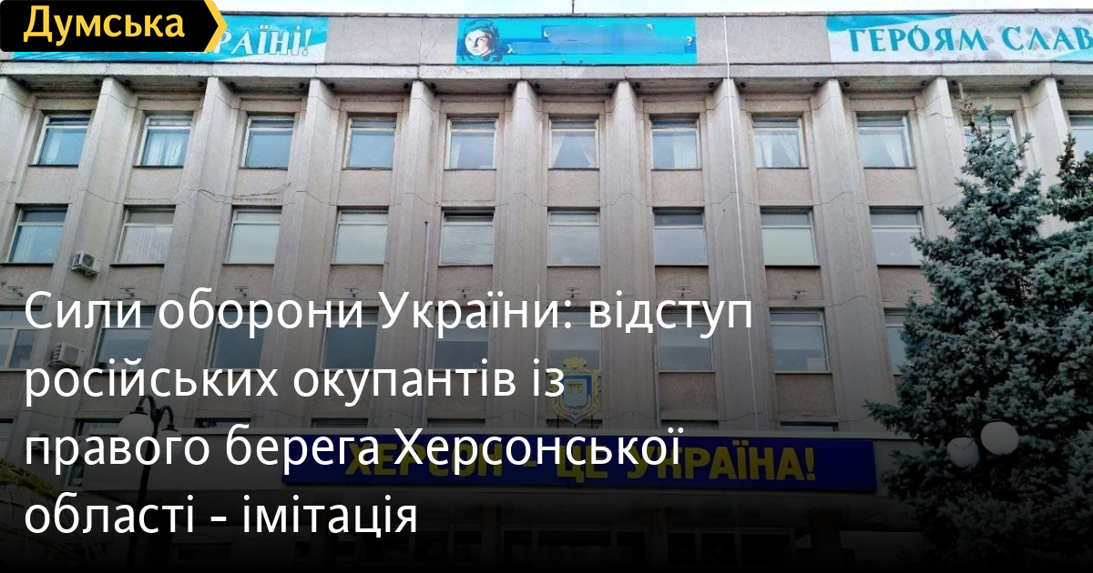 Сили оборони України: відступ російських окупантів із правого берега Херсонської області — імітаціяРосіяни імітують відступ із правого берега Дніпра в Херсонській області, щоб влаштувати провокацію. Про це повідомила начальниця Об'єднаного координаційного пресцентру Сил оборони України «Південь» Наталія Гуменюк. За її словами, підрозділи окупантів залишаються в Херсоні та інших населених пунктах, заселяючись у будинки, з яких виїхали українці. Вони переодягаються в цивільних, щоб потім звинуватити збройні сили України в обстрілі мирного населення. Крім того, у рамках підготовки до оборони росіяни мінують підступи та облаштовують укріплення. СМЕРТЬ РОСІЙСЬКИМ ОКУПАНТАМ! Помітили помилку? Виділяйте слова з помилкою та натискайте control-enter |