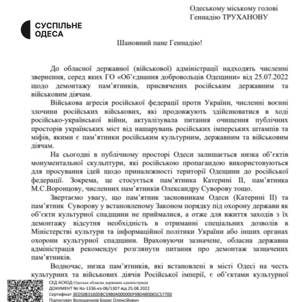 У листі, підписаному заступником голови ОВА Борисом Волошенковим та опублікованим «Суспільним», зазначено, що російська пропаганда використовує ці об'єкти «для просування ідей щодо належності території Одещини до російської федерації».