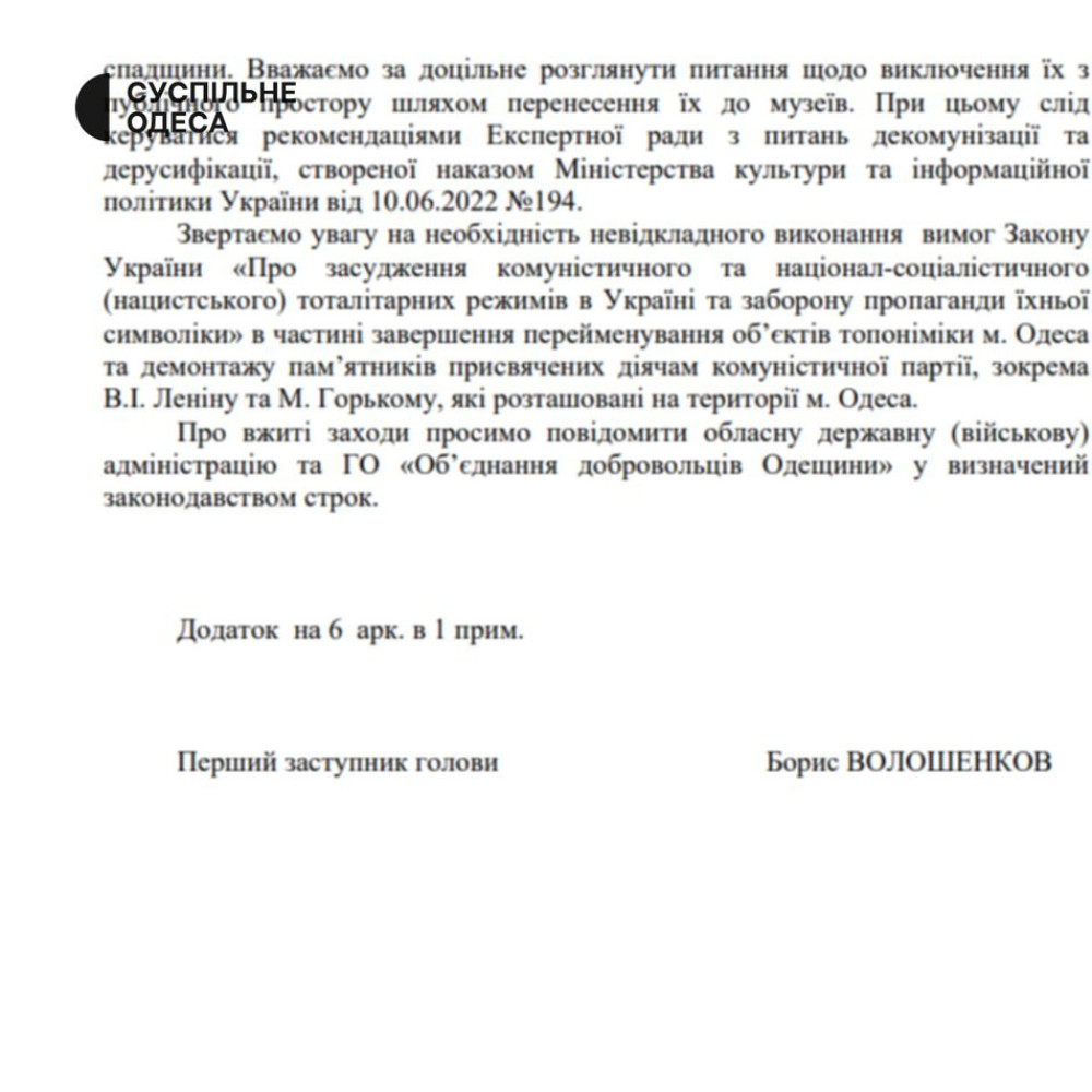 Також ОВА нагадує про необхідність завершити процес декомунізації: перейменувати вулиці та прибрати одеські пам'ятники Леніну та Горькому. До листа додано список на шести сторінках.