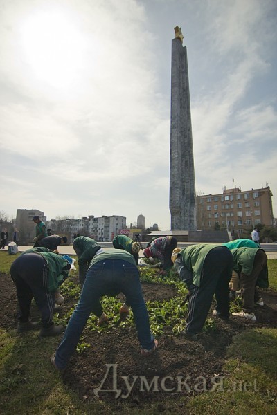 Масштабные работы по высадке цветов ко Дню Освобождения Одессы стартовали на площади 10 Апреля.