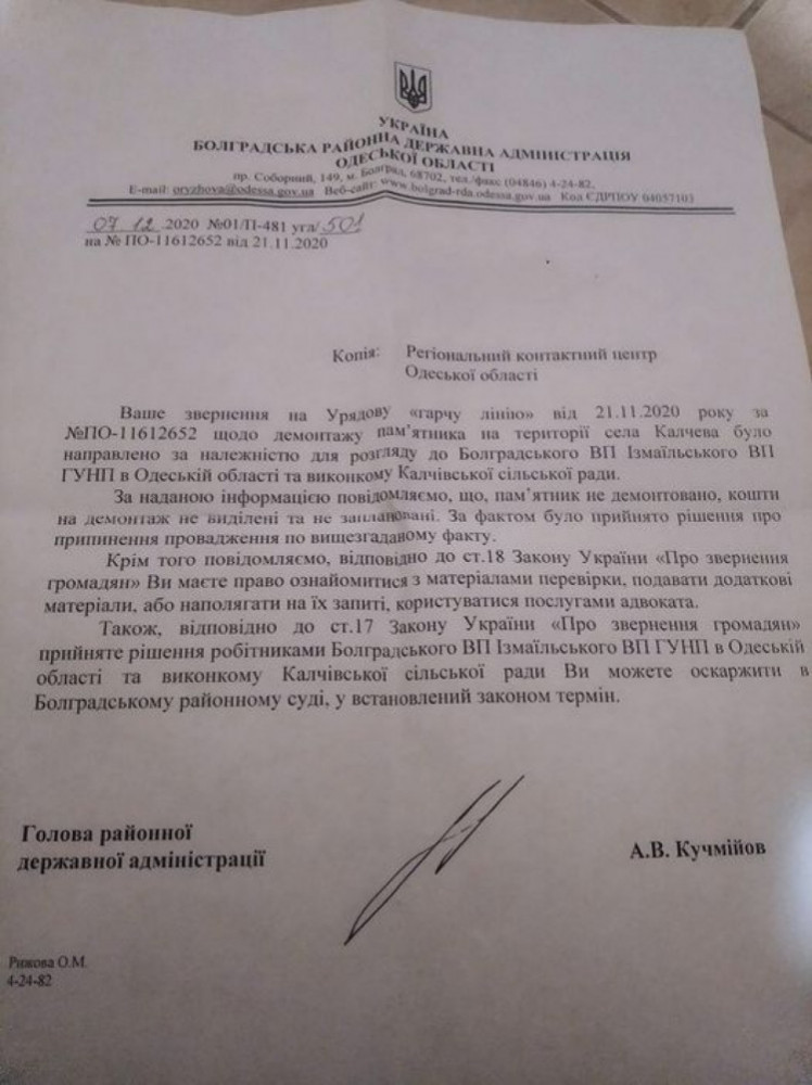 Полиция закрыла уголовное производство по факту нарушения закона Украины о декоммунизации в связи с недемонтированным памятником Ленину в селе Калчева Болградского района Одесской области.