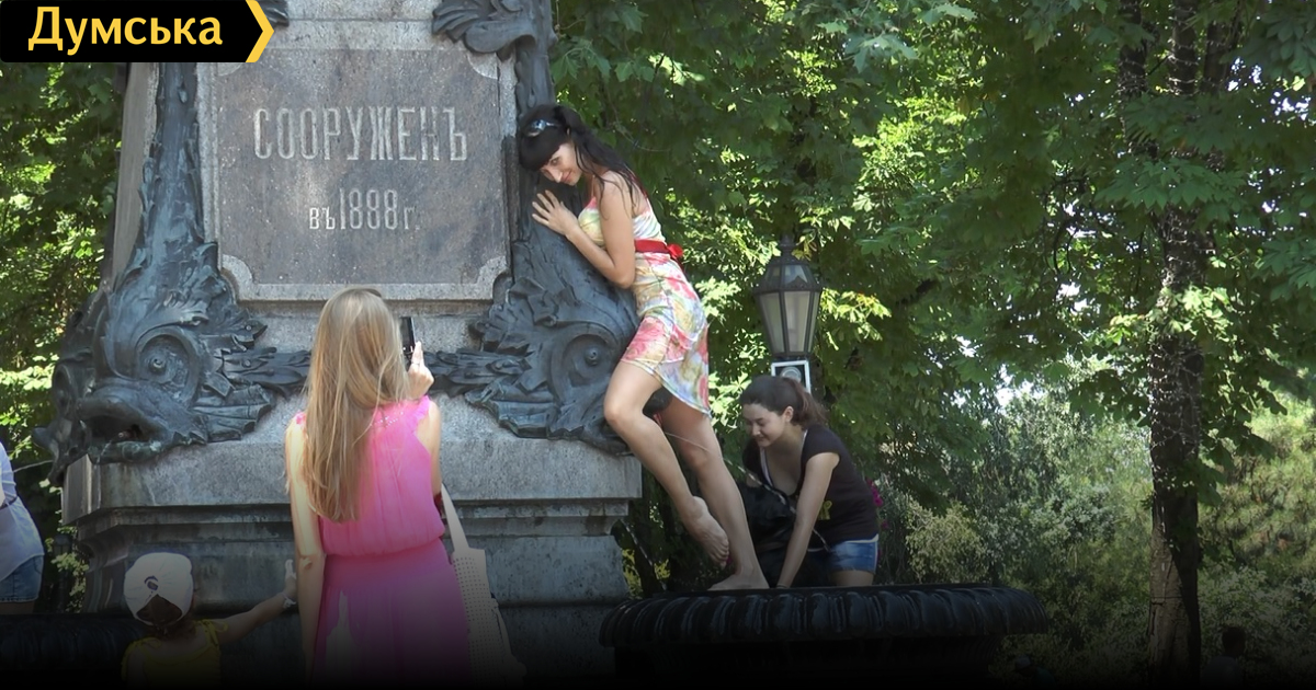 Наш читатель Владимир Науменко запечатлел подобное действо у памятника А. С. Пушкину, что на Думской площади. Несколько одесситок устроили публичную фотосессию в чашах фонтана, а одна из них даже искупала там свою собаку.