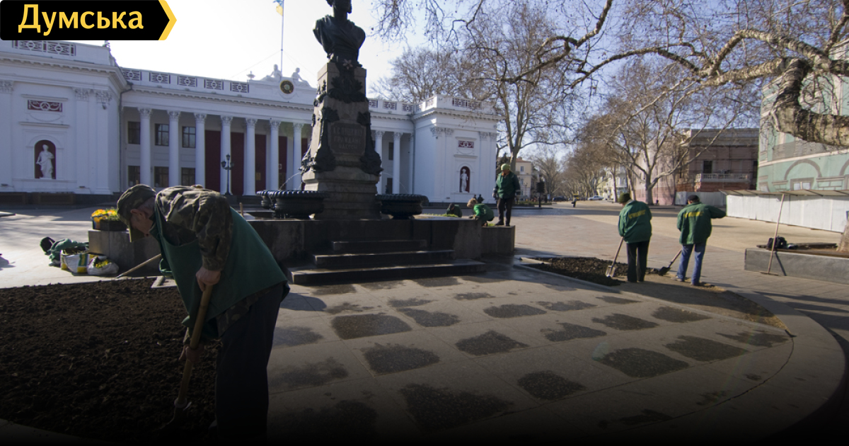 В Одессе приводят в порядок участок вокруг памятника Пушкину на Приморском бульваре. Сегодня сотрудники «Зелентреста» высаживали возле монумента незабудки, герань и фиалки.