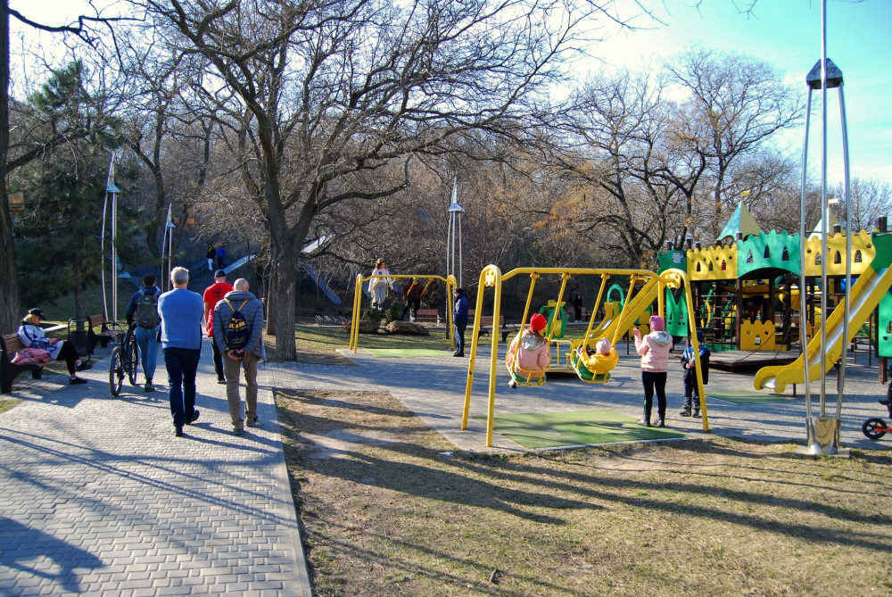 О войне в парке Шевченко мало что напоминает. Разве что звуки сирены воздушной тревоги, на которую одесситы реагируют с удивительным равнодушием и фатализмом. Впрочем, некоторые то ли в шутку, то ли всерьез обсуждают, можно ли спрятаться от ракетного удара за карантинной стеной или в бутафорской крепости.