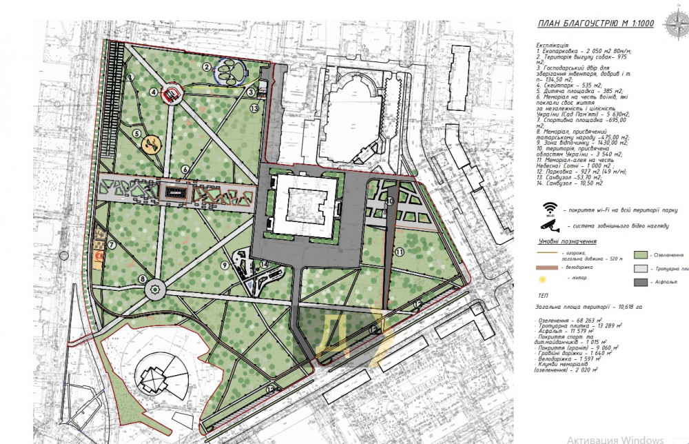 Кроме того, в парке, согласно концепту, создадут территорию, посвященную областям Украины, экопарковку, территорию для выгула собак (на плане она выполнена в форме отпечатка собачьей лапы), скейтпарк, зону отдыха, игровую и спортивную площадки, два санузла.