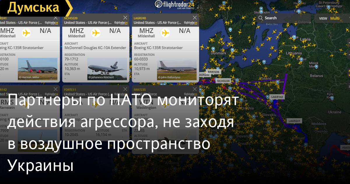 Партнеры по НАТО мониторят действия агрессора, не заходя в воздушное пространство УкраиныАвиация НАТО следит за врагом, не входя в воздушное пространство нашей страны. Сегодня вечером сразу шесть самолетов, среди которых несколько летающих танкеров, контролировали украино-белорусскую границу и ситуацию в Черном море. Стратегический разведчик Boeing RC-135W мониторил границу Польши с РБ, отслеживая пуски ракет и активность авиации, а беспилотник Northrop Grumman RQ-4B Global Hawk патрулирует Черное море. Возможно в приграничные районы воздушного пространства Польши и Румынии приходили истребители и стратегическая авиация. Об этом можно судить по присутствию в регионе трех Boeing KC-135R Stratotanker и одного McDonnell Douglas KC-10A Extender. СМЕРТЬ РОССИЙСКИМ ОККУПАНТАМ! Заметили ошибку? Выделяйте слова с ошибкой и нажимайте control-enter |