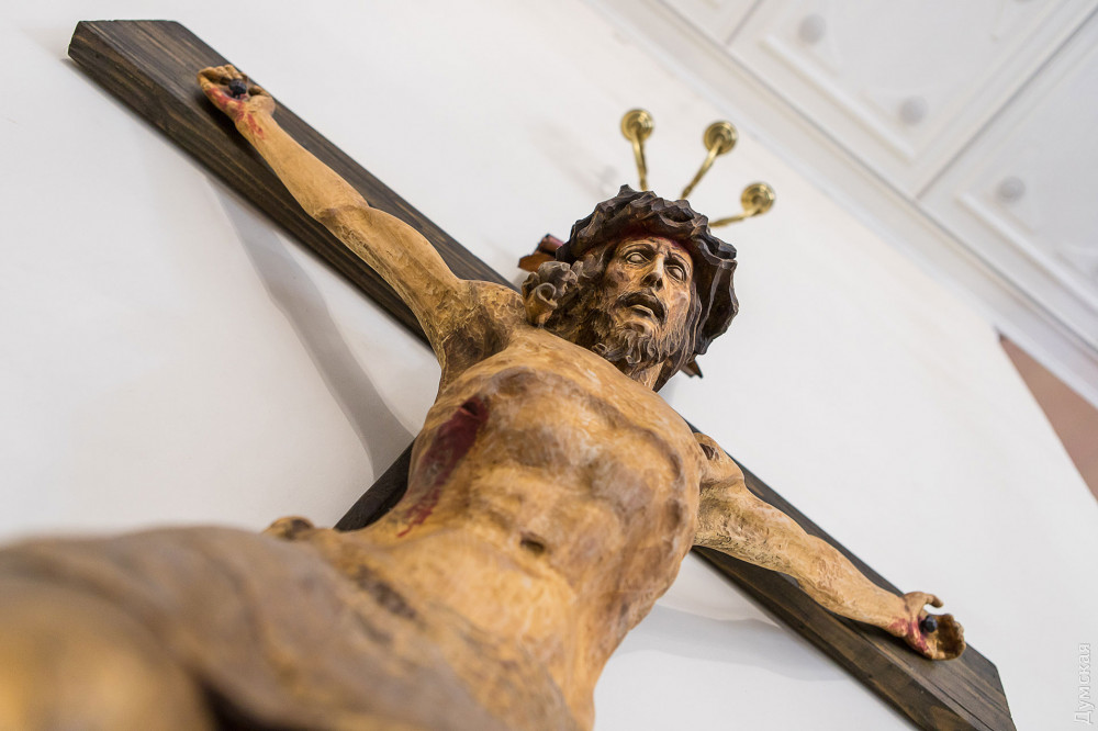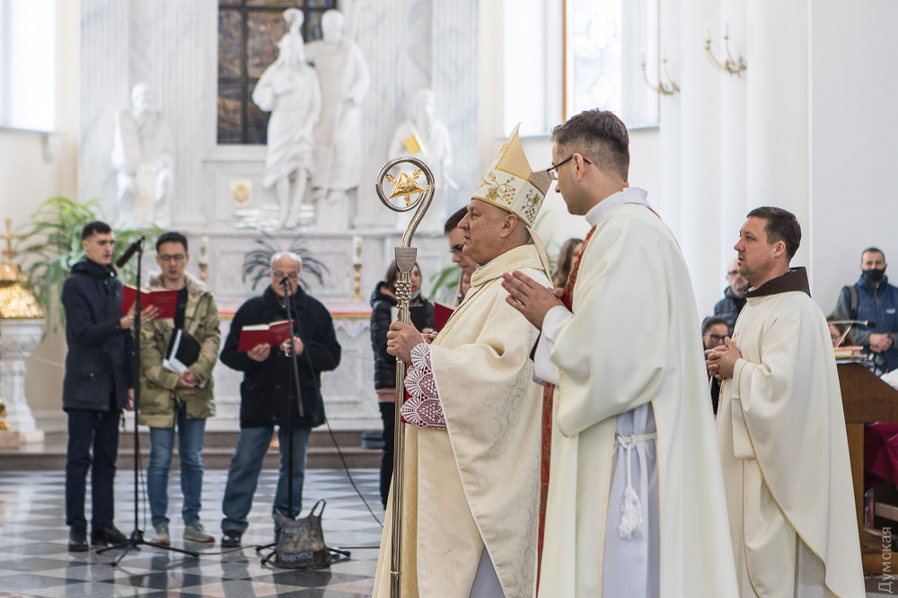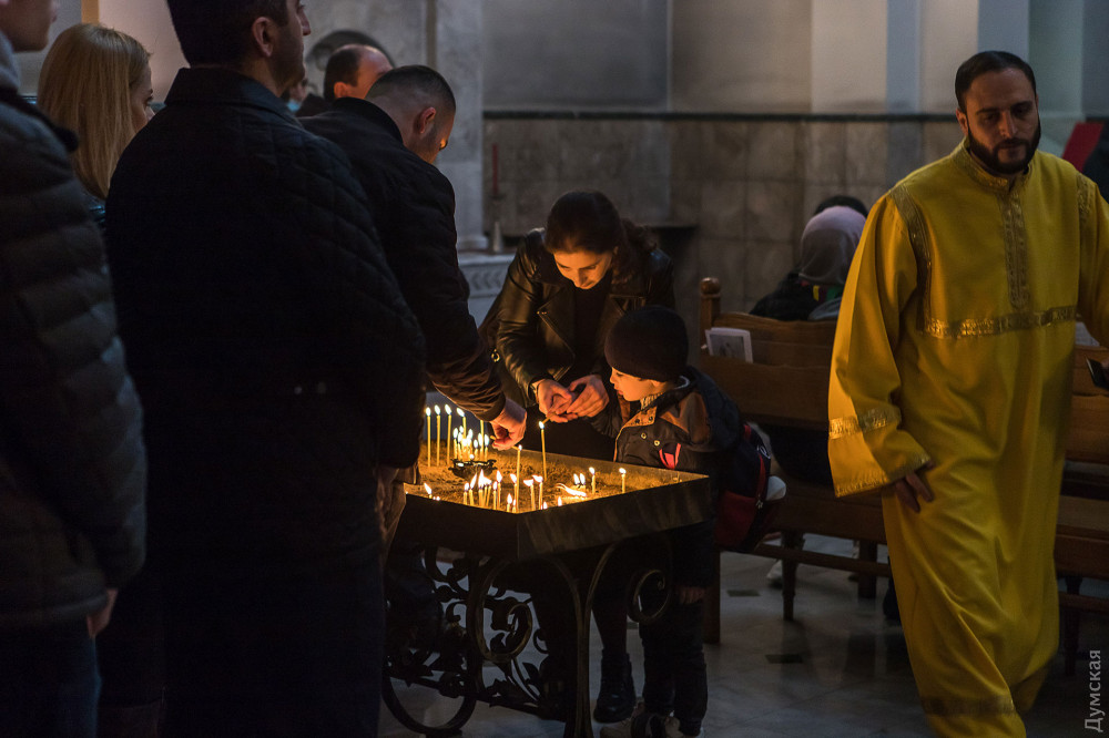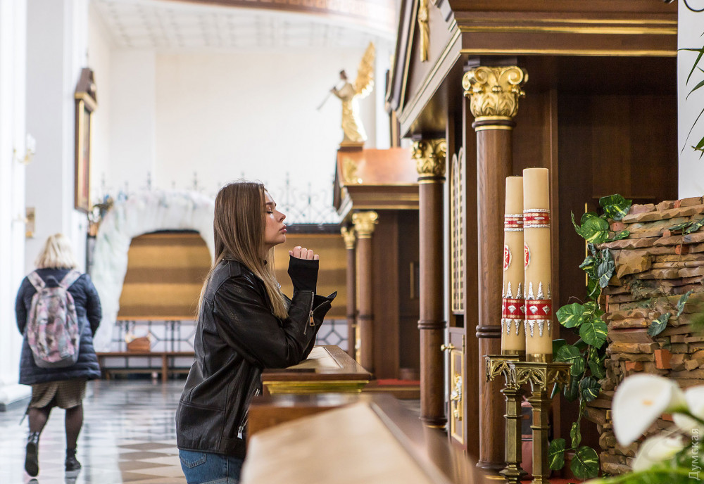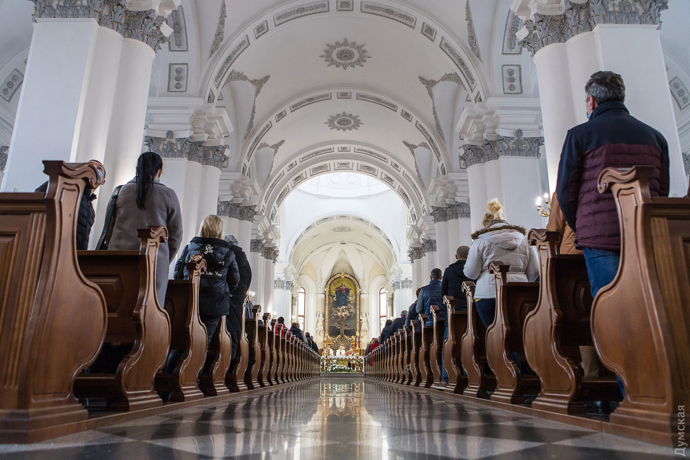 Праздничные мессы в главном католическом храме города проводят на трех языках: с самого утра можно было послушать проповедь на русском, до обеда — на украинском и польском языках, после обеда – на английском.