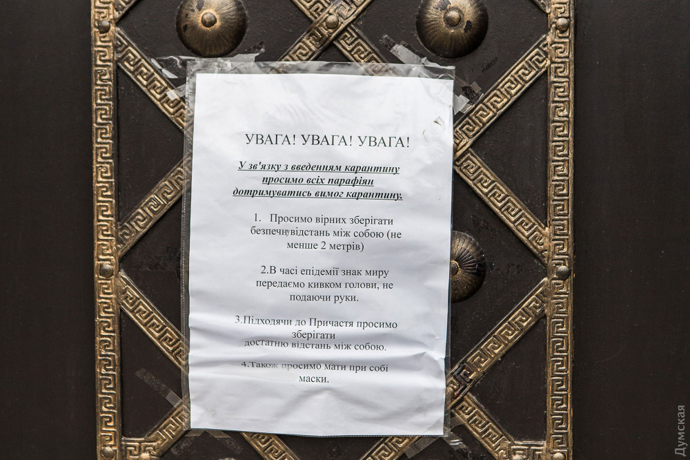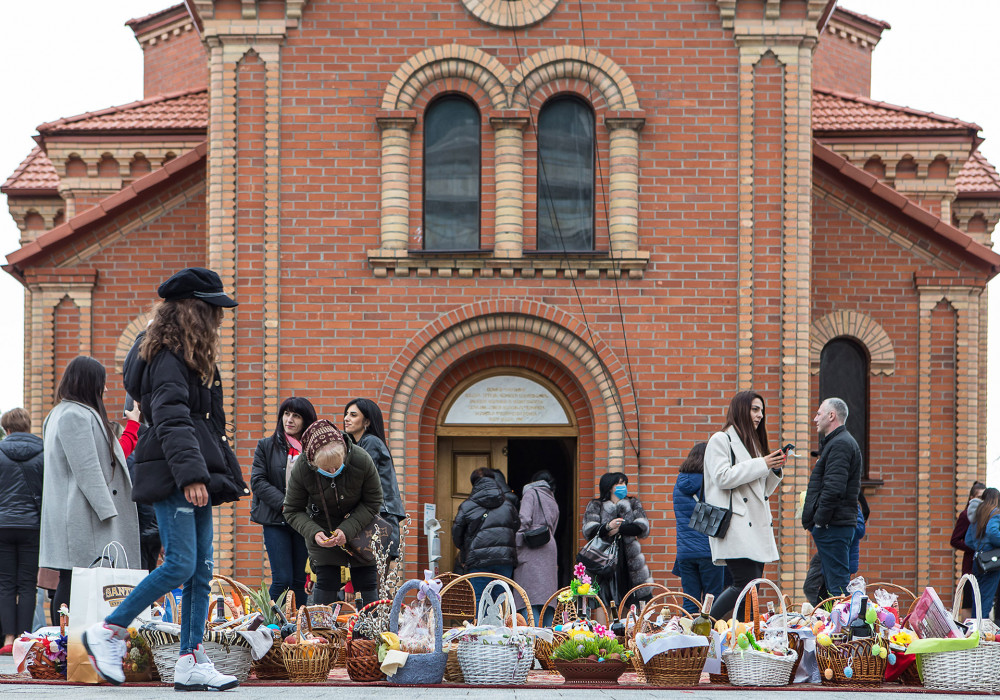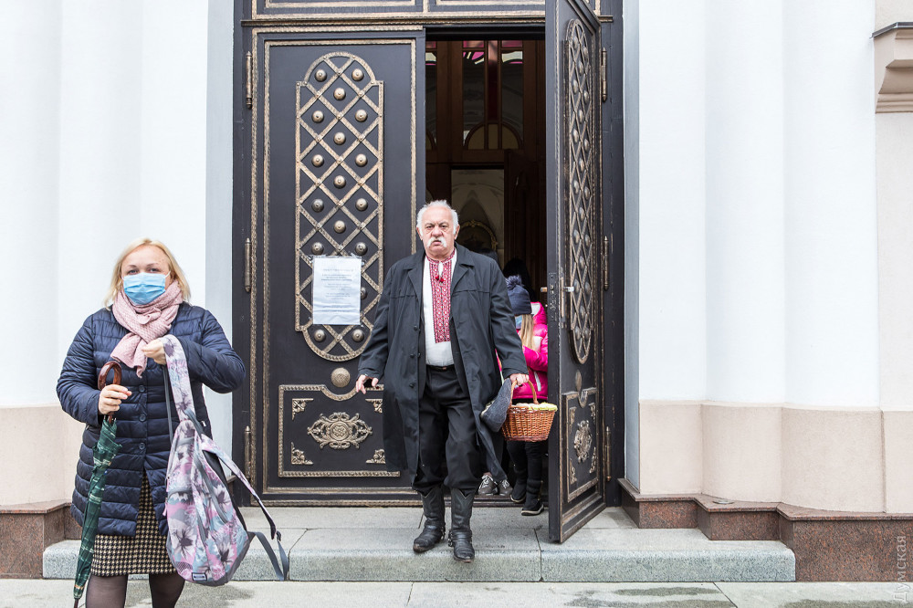 Римо-католики серьезно относятся к карантину — праздничное богослужение можно было посмотреть в онлайне. Тем же, кто принял решение посетить собор лично, необходимо было быть в медицинской маске и соблюдать дистанцию. На дверях храма висит напоминание, в котором рукопожатие рекомендовали заменить кивком. В самой церкви, кроме свечек и освященной воды, – диспенсеры с антисептиком.