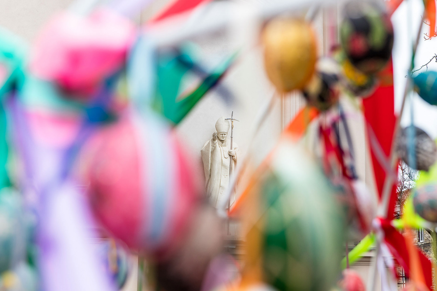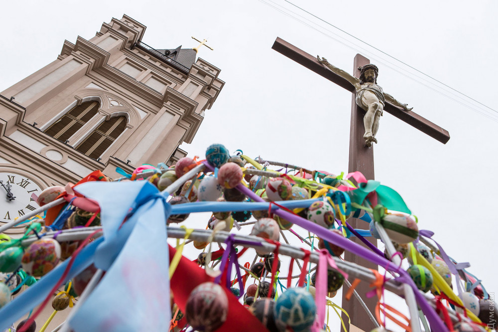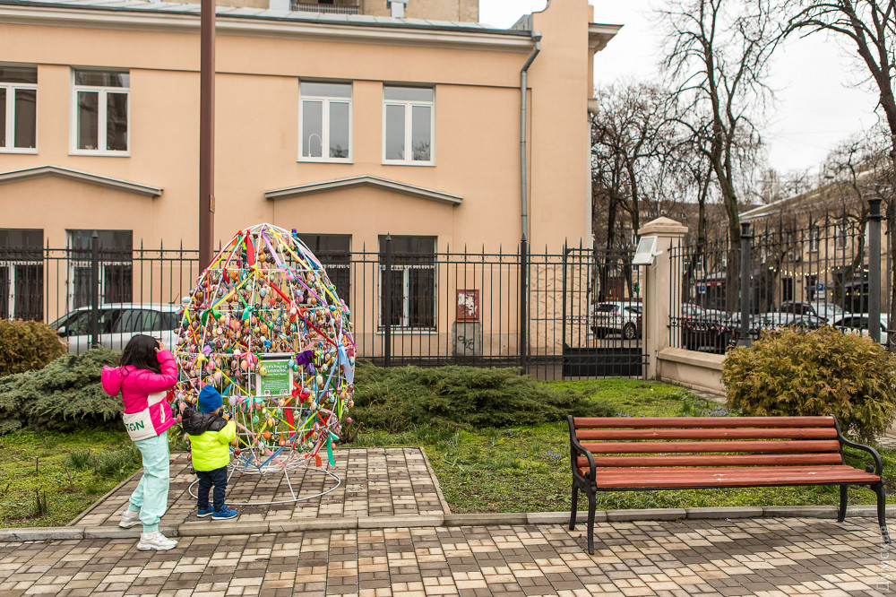 Перед зданием собора установили огромный каркас в виде пасхального яйца. С помощью лент прихожане смогли украсить его принесенными из дома крашанками.